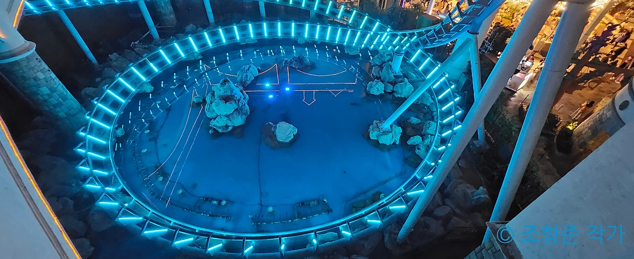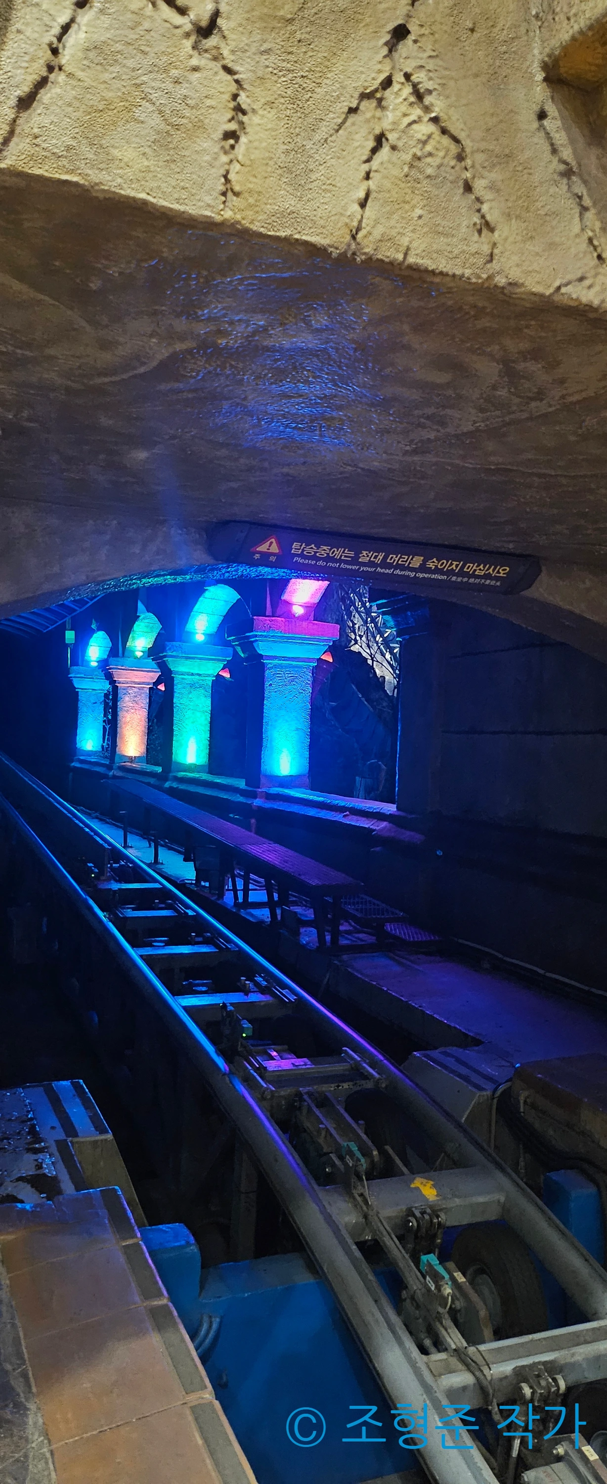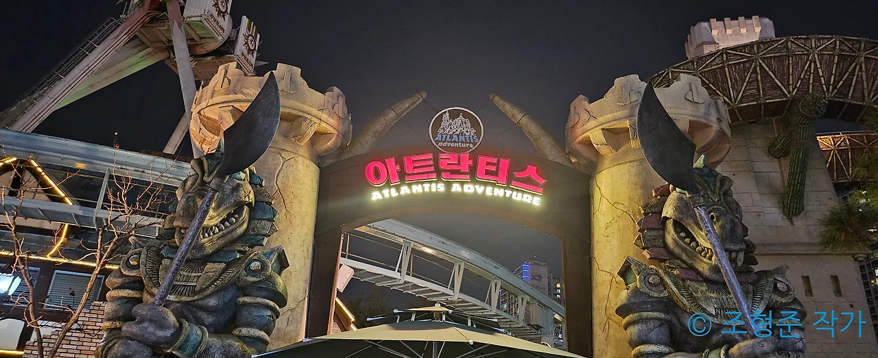 두 번째 어트렉션은 명실상부한 아트란티스였다. 롯데월드에 와서 아트란티스를 안 타는 것은 진수를 느끼지 않은 것이나 다르지 않다. 애당초 롯데월드에서만 탈 수 있는 유일무일한 어트렉션인 만큼 나에게는 안 탈 수가 없었다. 여기서도 팁을 주면 극성수기가 아니면 밤에는 사람들이 별로 없다. 대략 오후 6시부터는 단체 이용객이 빠지게 된다. 이후부터는 롯데월드를 진심으로 좋아하는 팬들만 남는다고 보면 된다. 그러니 그런 점을 감안해서 탑승이 마감되기 전에 재빠르게 줄을 서면 조금이나마 유리해진다. 그리고 입구를 지키는 두 석상도 아트란티스의 상징 중 하나라서 사진으로 남기고 20분 정도의 대기 시간 끝에 탔는데 아트란티스는 여러 번 타도 질리지 않아서 항상 급발진을 할 때부터 웃음을 짓고 두 차례의 낙하 구간에서는 거의 환호성을 질렀다. 워낙 많이 타서 질릴 법하지만 아트란티스에는 그런 일이 벌어지지 않게 하는 유니크한 점이 가득했다.