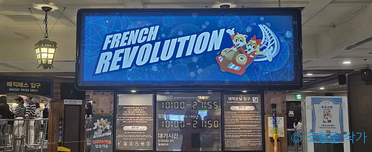 세 번째 어트렉션은 후렌치 레볼루션이다. 후렌치 레볼루션도 아트란티스와 다른 면에서 질리지 않는 매력을 가득 보유하고 있었다. 실내 롤러코스터임에도 그런 약점을 슬기롭게 극복하는 것을 보면 감탄이 절로 나온다. 여기서 팁을 드리면 360도 루프 구간에서 우리를 보고 있는 사람을 세어보는 것도 은근히 재미 포인트이다. 비록 얼굴이 잘 보이지는 않지만 잠깐이나마 그들과 우리가 서로 가깝게 만난다는 것을 느끼는 경험도 후렌치 레볼루션와 같은 실내 롤러코스터에서만 느낄 수 있었다. 참고로 후렌치 레볼루션도 되도록 손을 드는 것을 추천한다. 손을 들 때는 에어타임 덕분에 잠시지만 무중력 상태를 체험할 수 있다.