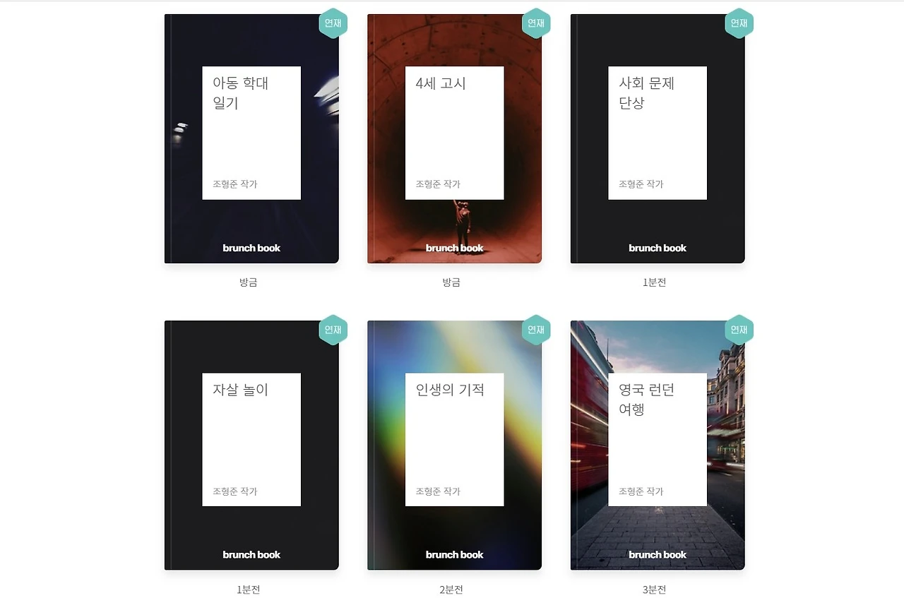일단 연재 일정이 어느 정도 확정된 여섯 개의 브런치북을 미리 저장해놨습니다. 앞서 말했듯이 '두 놀이동산과 나'의 연재가 끝나고 나서 이 연재들이 시작될 예정인데 그 중에서 자살놀이와 인생의 기적은 이번 연재가 끝난 뒤 조금의 휴식을 즐기고 나서 동시 연재할 예정이고 영국 런던 여행은 말 그대로 런던을 여행하며 겪었던 이야기를 다루는 에세이라고 생각해주시면 됩니다. 아동 학대 일기는 제가 '아동 학대 가해자'에게 아동 학대를 당했을 때 경험을 일기 형태로 쓸 예정이고 4세 고시는 헤르만 헤세의 '수레바퀴 아래서'의 21세기 버전이라고 할 수 있는 사회 소설입니다. 사회 문제 단상도 사회의 문제점에 대한 저만의 생각을 짧게 다루는 에세이입니다. 이렇게 해서 간단하게 내년에 올라갈 브런치북을 소개하며 글을 마치겠습니다.