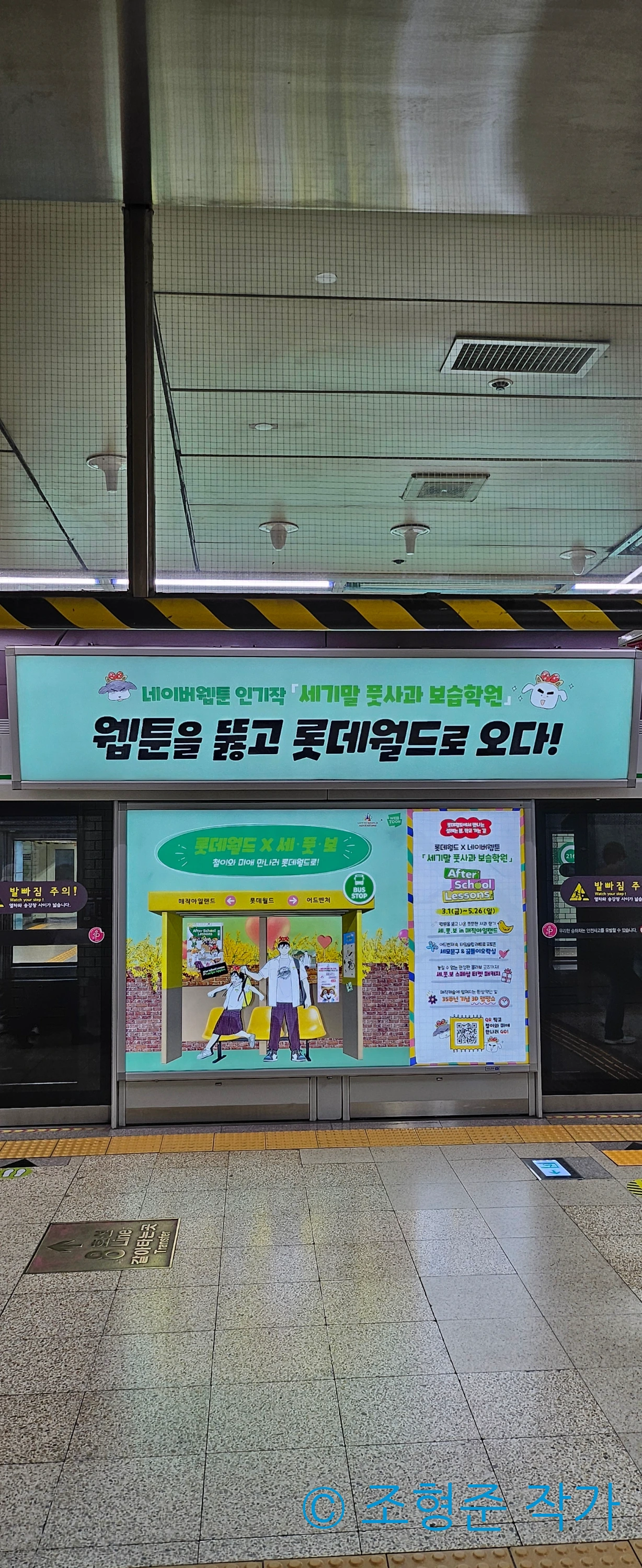 하지만 아쉽게도 이후에는 다른 일정이 있어서 오늘의 목표인 거울미로와 추가로 탑승한 신밧드의 모험을 타고 난 다음에 바로 출구로 나가야 했다. 참고로 잠실역에서는 롯데월드 어드벤처에서 진행하는 축제나 콜라보를 다루는 광고를 어렵지 않게 볼 수 있다. 예상보다 일찍 나가야 하는 게 아쉬운 나머지 이를 사진으로 남기는 걸로 하루가 끝났다.