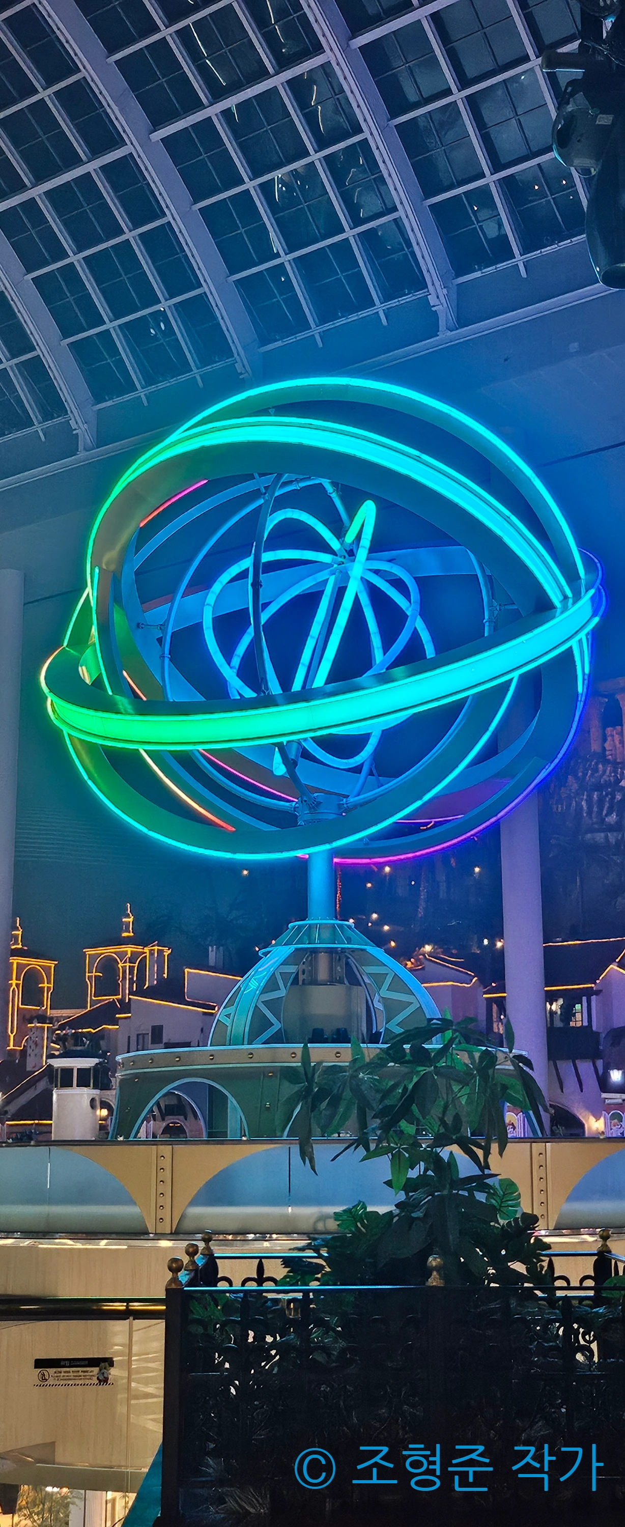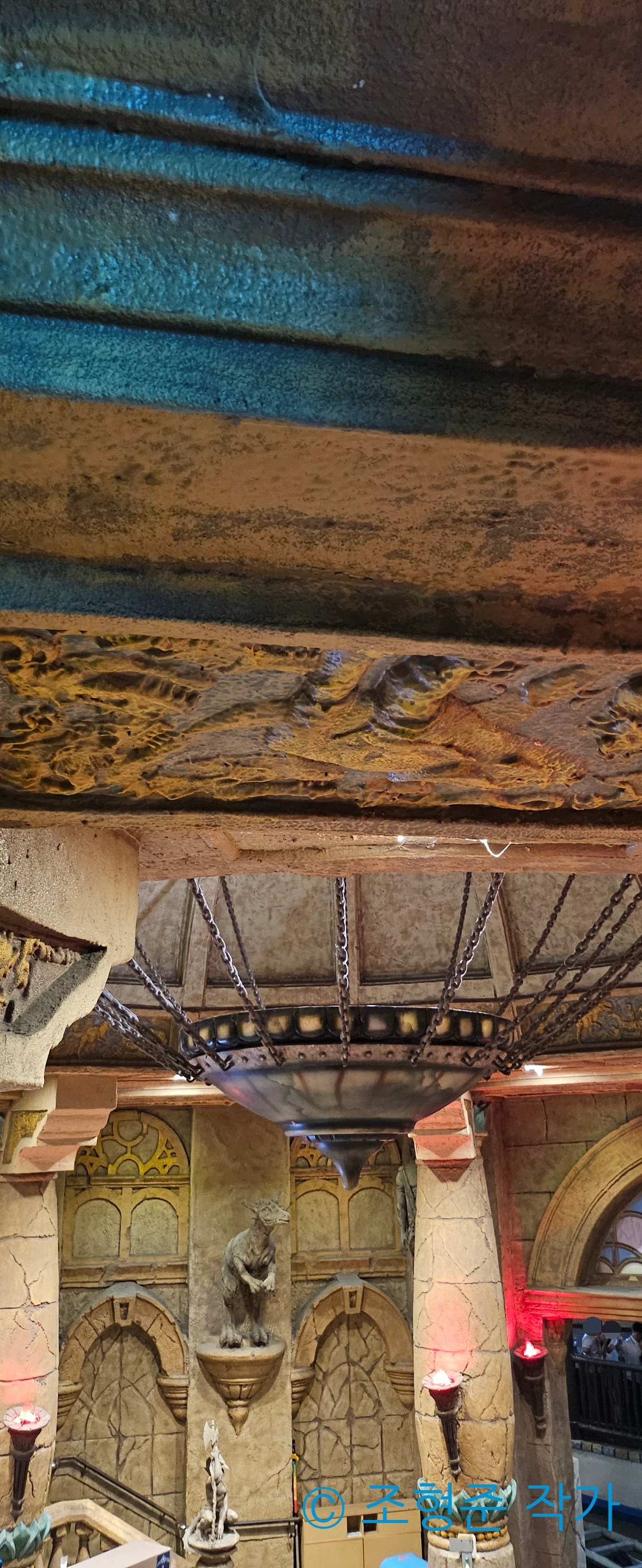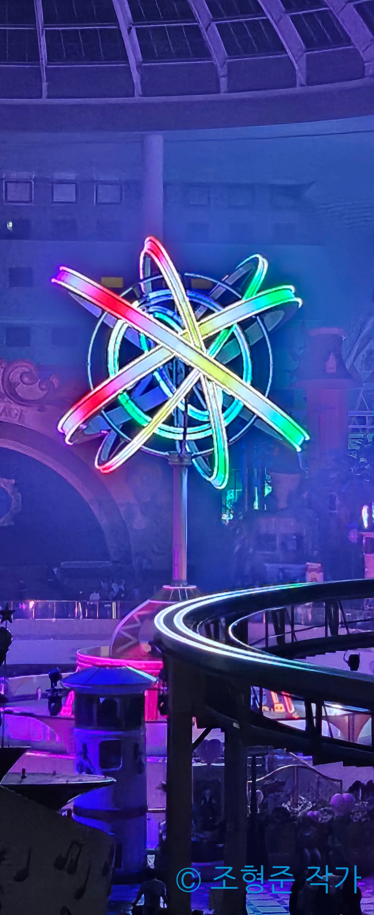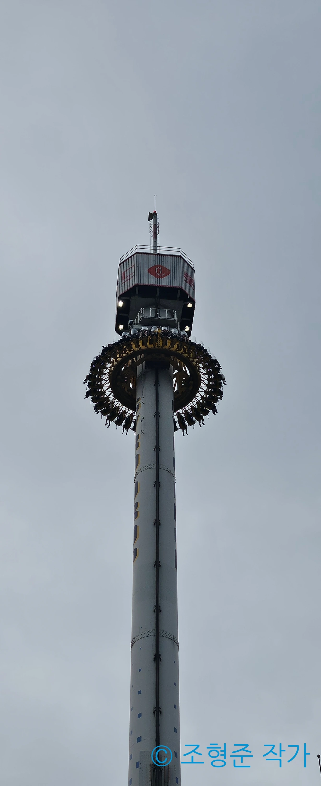 파라오의 분노까지 타고 나서 3층에 있는 비밀 통로로 가서 후렌치 레볼루션의 하이라이트 구간인 540도 코너링 레일도 보고 때마침 내려온 비클도 구경하며 휴식하다가 매직 아일랜드로 나갔다. 앞서 말했듯이 상당히 흐려서 조금만 먹구름이 많아지면 곧장 비가 내릴 것 같았다. 비가 내리면 안 되기 때문에 조마조마한 마음을 갖고서 매직 아일랜드에서의 첫 어트렉션은 자이로스핀을 타기로 했다. 자이로스핀에는 탑승해야 볼 수 있는 조형이 있어서 이 조형을 사진으로 남겼다. 자이로스핀은 스릴 정도에서는 가장 낮지만 롯데월드타워와 석촌호수를 한 눈에 담아서 볼 수 있어서 만족하며 탈 수 있었다.