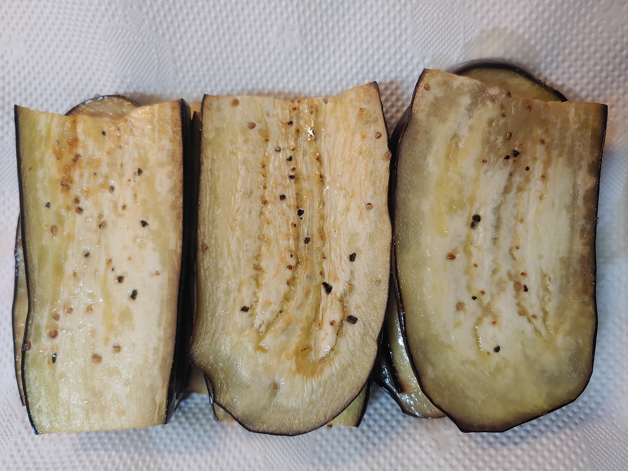 3. 팬 달군 후 약불로 줄이고 버터나 들기름(또는 갖은 종류의 오일)을 얇게 둘러 소금을 뿌리지 않은 면부터 가지가 닿게 올린다.
