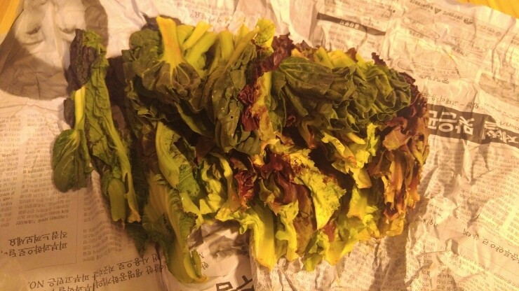 그리고 오늘에서야 처음 냉장고에서 꺼내 그 둘둘 말아놓은 신문지를 풀고 씻어서 그것들만으로 샐러드를 만들어 먹었다. 처음 먹어 본 겨자잎의 알싸한 맛이, 아무 맛도 없어 좋아하지 않던 상추 줄기의 달큼함이, 그 외의 것들의 아삭함이 매우 좋았다.