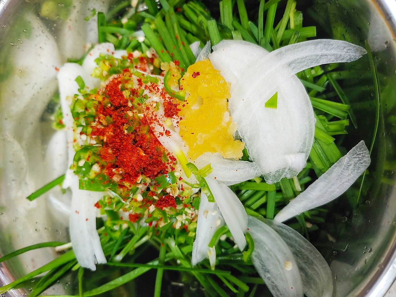 양파를 얇게 써는 것은 균일한 식감을 주고자 부추와 굵기를 맞추기 위한 것이니, 번거롭다면 양파의 굵기는 취향에 따라 하면 된다.