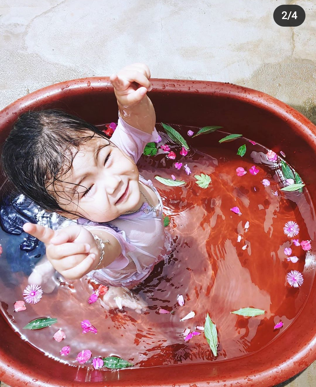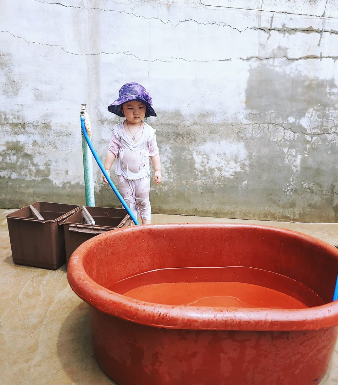 볕에 물을 데우려고 받는 중 물장난으로 홀딱 젖었다.