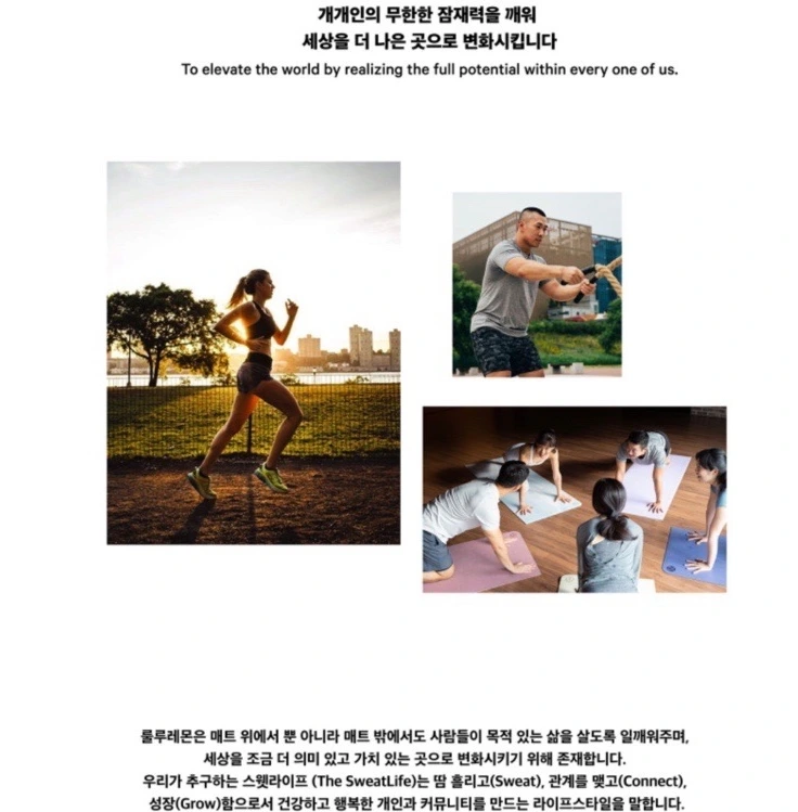 땀 흘리는 삶이라는 슬로건은 모든 스포츠 브랜드가 사용할 수 있는 흔한 메시지다. 하지만 룰루레몬은 다른 브랜드에 비해 메시지에 과도하게 집착한다고 느껴진다. 그 이유를 두 가지로 정도로 생각해 보았다.