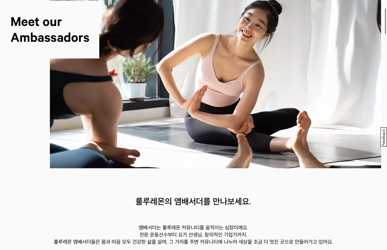 룰루레몬의 앰배서더는 요가, 필라테스, 크로스핏, 복싱, 명상 등 각 분야의 스포츠에서 트레이너로서 두각을 나타내고 있는 사람들 또는 주변 사람들에게 긍정적인 에너지를 발산하는 사람들 위주로 선정된다. 앰배서더로 선정된 이들은 가장 먼저 룰루레몬의 제품을 착용해 볼 수 있고 자신이 사용해 본 제품에 대해 솔직하게 피드백을 한다. 그리고 룰루레몬에서 진행하는 다양한 클래스를 지도하며 룰루레몬의 고객과 소통한다. 룰루레몬은 앰배서더로 선정된 이들이 계속 건강한 삶을 유지할 수 있도록 필요한 지원을 아끼지 않는다.