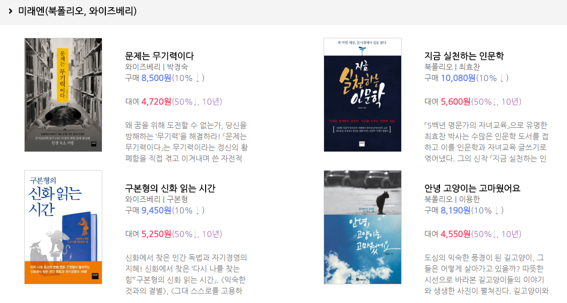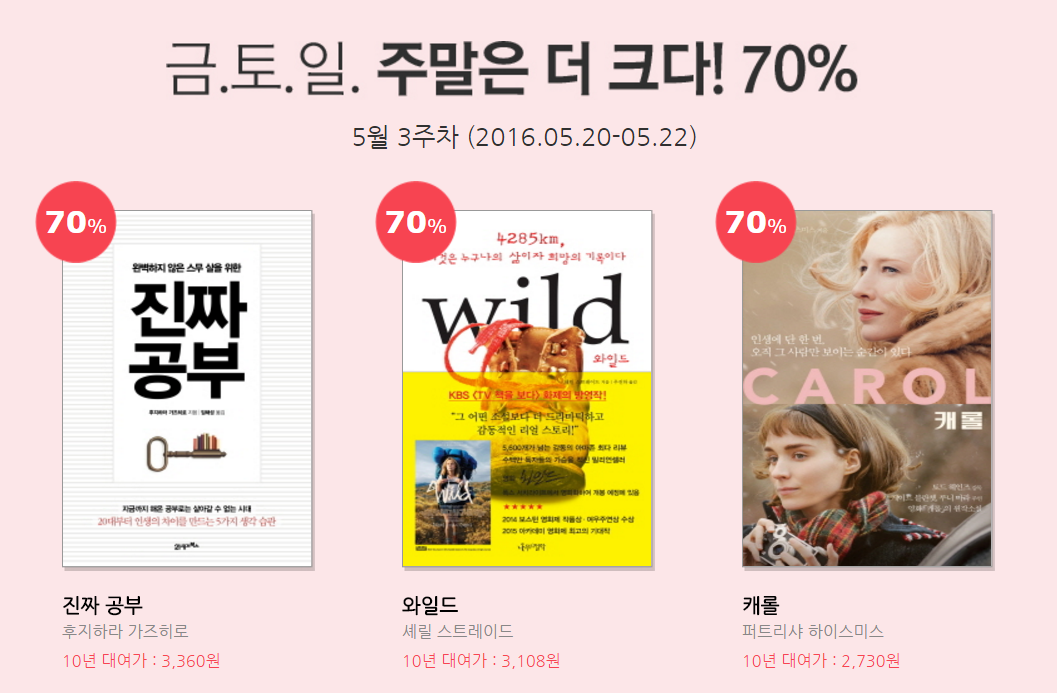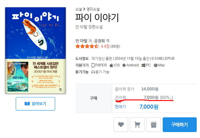 전자책은 보통 종이책보다 30% 정도 저렴한 가격에 판매가 된다. 게다가 전자책 서점의 이벤트나 출판사의 이벤트가 더해지면 편의점에서 사는 과자 한 봉지보다 싼 가격에 양질의 책을 사 볼 수가 있다.