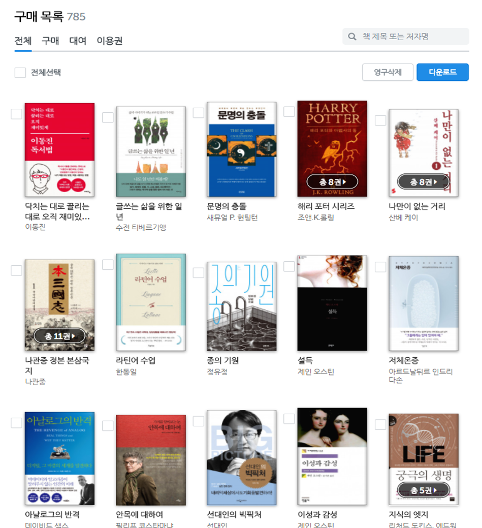 제가 가지고 있는 전자책은 400종입니다. 세트 구성을 포함하면 750권이 됩니다.
