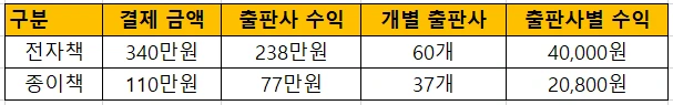 보통 전자책 구입 금액의 일부가 출판사에 정산이 된다고 가정하면 총 60개의 출판사가 4만 원의 수익을 올리게 됩니다. 개인의 데이터로 측정하였기 때문에 매우 적은 금액이라고 할 수 있지만 저 같은 고객이 1천 명이 있다고 가정할 경우 각 출판사에 4천만 원의 수익을 기대할 수 있습니다. 전자책을 구매하므로 기존 종이책의 기여도 대비 2배 이상이 상승했고 종이책 구매 또한 크게 줄지 않았기 때문에 전자책의 활성화 자체는 출판 시장 활성화에 중요한 활력소가 될 거라고 예측할 수 있습니다.