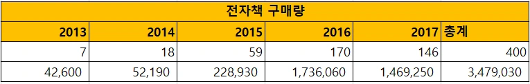 연도별 전자책 구입량은 2015년을 기점으로 늘어납니다. 몇 가지 요인을 보자면 네 가지로 정리됩니다.