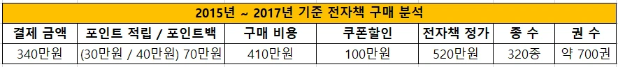 지난 5년간 전자책 구입비를 분석해보았습니다. 340만 원 결제하며 30만 원의 포인트를 지급받고 40만 원의 포인트는 도서 구매 이벤트를 통해 얻습니다. 서점의 포인트는 책을 구입하는데 1:1 사용이 가능하므로 총 구매 비용은 410만 원이 됩니다. 여기서 출판사의 이벤트 할인과 서점사의 추가적인 쿠폰 할인을 통해 정가 518만 원에 해당하는 320종의 전자책을 구매하게 됩니다. (나머지 80권은 무료책)