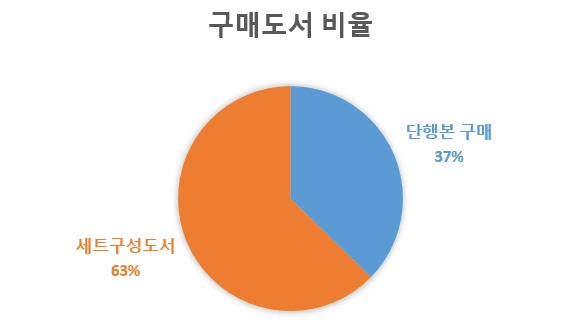 세트 도서는 하나의 지식이나 주제에 대해 심도 있게 구성된 지식의 보고라고 할 수 있는데 그 누구도 1권 이상 제대로 완독을 한 사람이 없습니다. 때문에 종이책 세트는 집을 꾸미는 인테리어 혹은 소장하고 있다는 만족감에 그치는 경우가 다반사였습니다. 책을 쓴 사람이나 구성한 출판사나 읽은 독자나 안타까운 일입니다. 세트 도서의 단점은 곧 전자책의 가장 큰 장점으로서 활약합니다. 무거운 세트 도서를 종이 한 장 무게로 지니고 다닐 수 있고 언제 어디서나 이어 보기를 할 수 있기 때문입니다. 아래의 데이터를 보면 구매 도서 320종 750권에서 단행본 280권을 제외한 470권이 바로 40종의 세트 구성 도서입니다. 전자책 세트는 가격 할인율이 높을뿐더러 구매하면 언제든 편리하게 읽을 수 있고 전자책의 장점을 극대화할 수 있다는 생각에 구매욕을 부추기곤 합니다. 결국 집에 있는 세트도 읽기를 위해서는 전자책 세트를 중복 구매하게 됩니다.