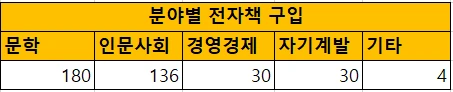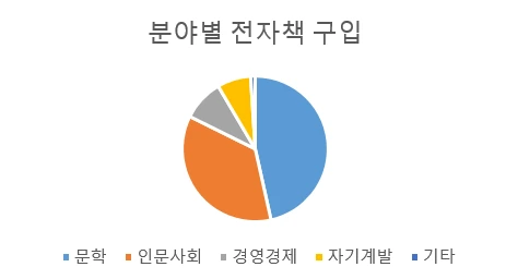 분야별 독서 성향은 개인 취향에 따라 다른데 저 같은 경우 문학과 비문학이 4:6 정도의 비율입니다. 실용서나 학습서의 구매가 별로 없는 이유는 보통 큰 판형의 책이 많고 뚜렷한 목적을 가지고 있기 때문에 텍스트로만 이루어진 전자책에 잘 맞지 않고 표현하기가 쉽지 않아 전자책으로 출간이 많이 되지 않습니다. 글로 소비하는데 전혀 문제가 없는 일반 도서들의 구매가 빈번하다고 볼 수 있습니다. 책의 선택은 모두 개인의 취향에 달려 있기 때문에 전자책 독자가 조금 더 즐기는 장르가 있다고 보기 어렵습니다. 이는 종이책 베스트셀러와 전자책 베스트셀러가 유사한 이유이기도 합니다.