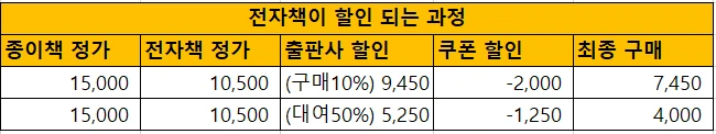 종이책과 전자책은 가격적으로 서로 다른 노선을 취하게 됩니다. 당연한 이야기지만 전자책은 제작비가 종이책에 비해 저렴합니다. 운송비는 전혀 들지 않습니다. 재고에 따른 유통관리 부담도 들지 않습니다. 이에 따라 전자책은 종이책 가격에서 약 30~40% 할인된 정가를 취하고 있습니다. (물론 더 저렴해져야 한다는 의견도 일부 있지만 종이책의 기획비용과 기회손실 비용을 전자책이 같이 부담하고 있습니다.) 일반적으로 종이책은 평균 13000원~20000원 사이의 가격을 형성하고 전자책은 8000원에서 12000원의 가격을 형성하고 있습니다. 물론 여기서 끝이 아닙니다. 서점과 출판사의 노오력으로 결국 최종 소비자 가는 아래와 같이 형성됩니다.
