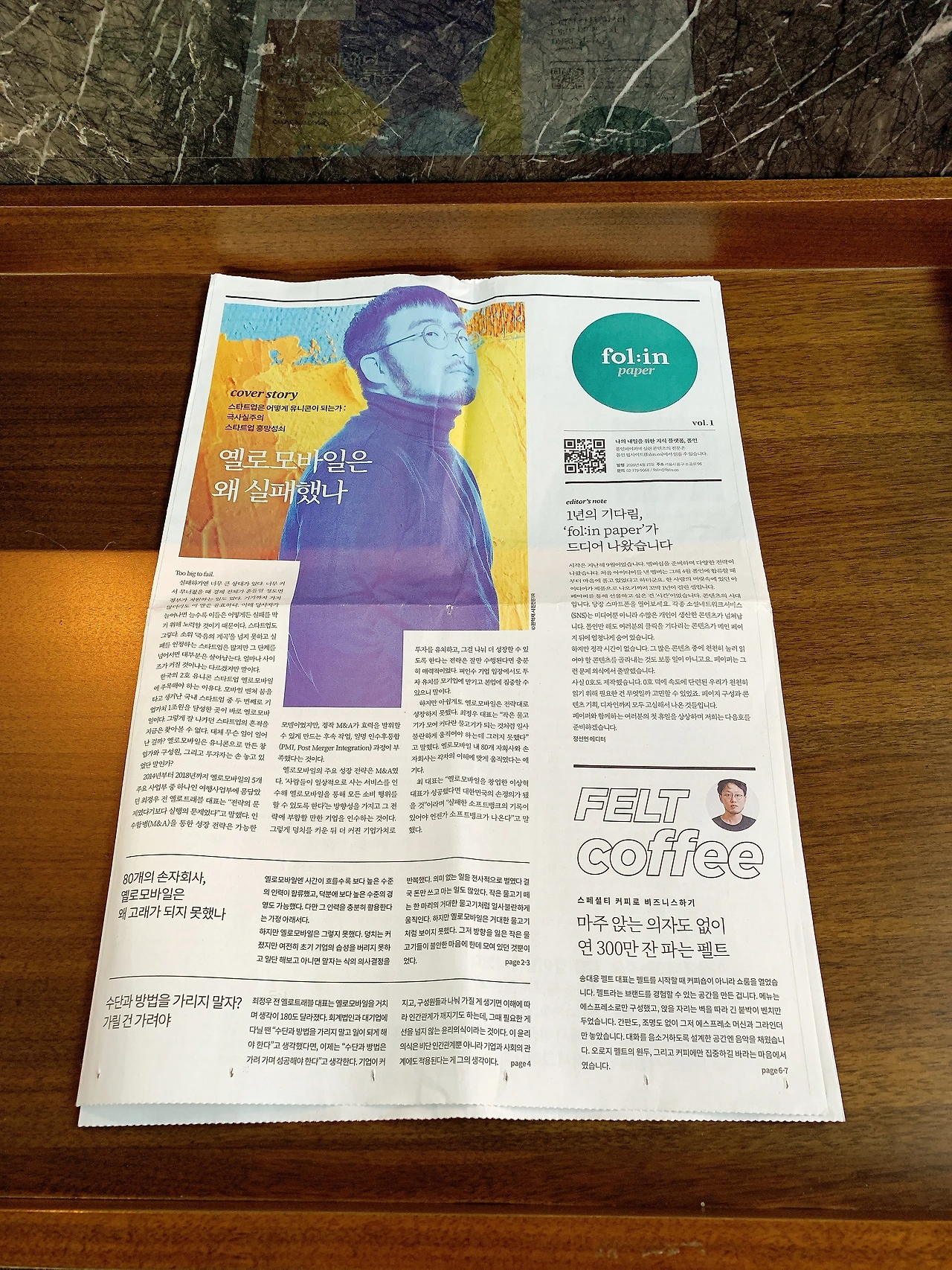 폴인페이퍼에는 한국 스타트업의 전설이 된 옐로모바일의 비사를 다룬 이야기 (스타트업은 어떻게 유니콘이 되는가 <- 최근 책으로도 출간되었는데 스타트업 경험을 한 사람으로서 정말 일독을 권한다.) 확장보단 본질에 집중하는 한국의 블루보틀 펠트 커피에 대한 이야기 등 흥미로운 아티클이 많았다. 아티클을 전부 읽는데 20분 정도의 시간이 걸렸는데 적절하다고 본다. 창간호이다 보니 다루는 아티클이 조금 한정적이라는 게 아쉬웠지만 글 밥이 너무 많아 읽기를 포기하는 것보다 나은 선택이라고 본다.