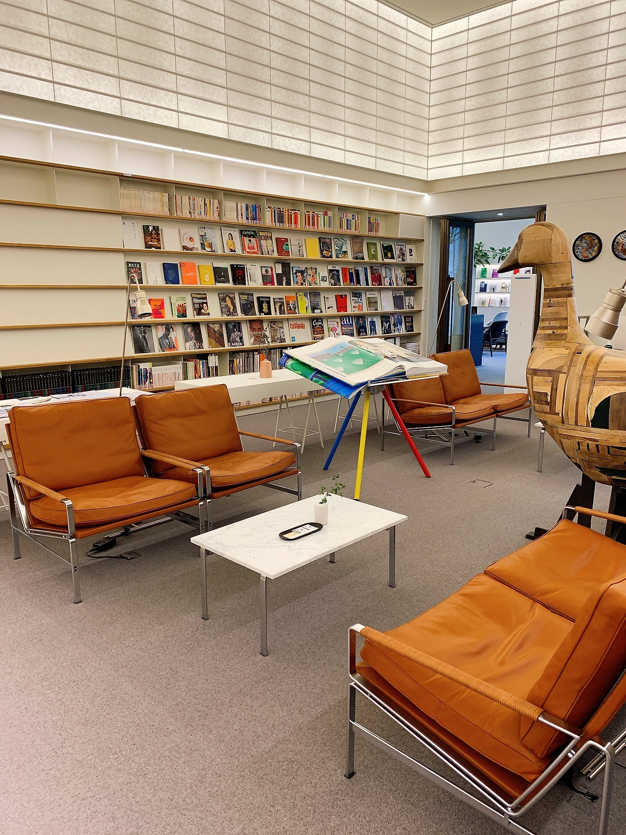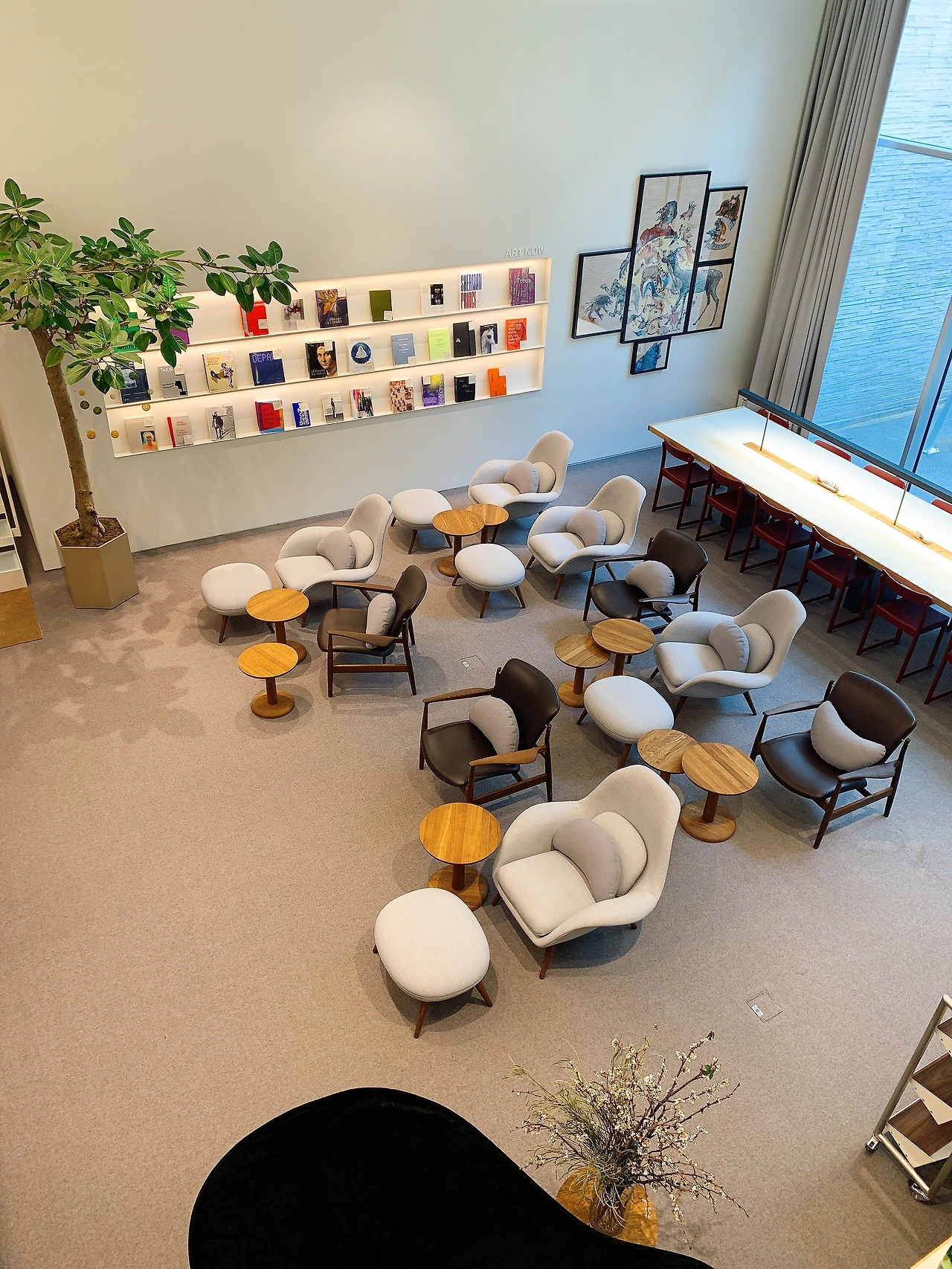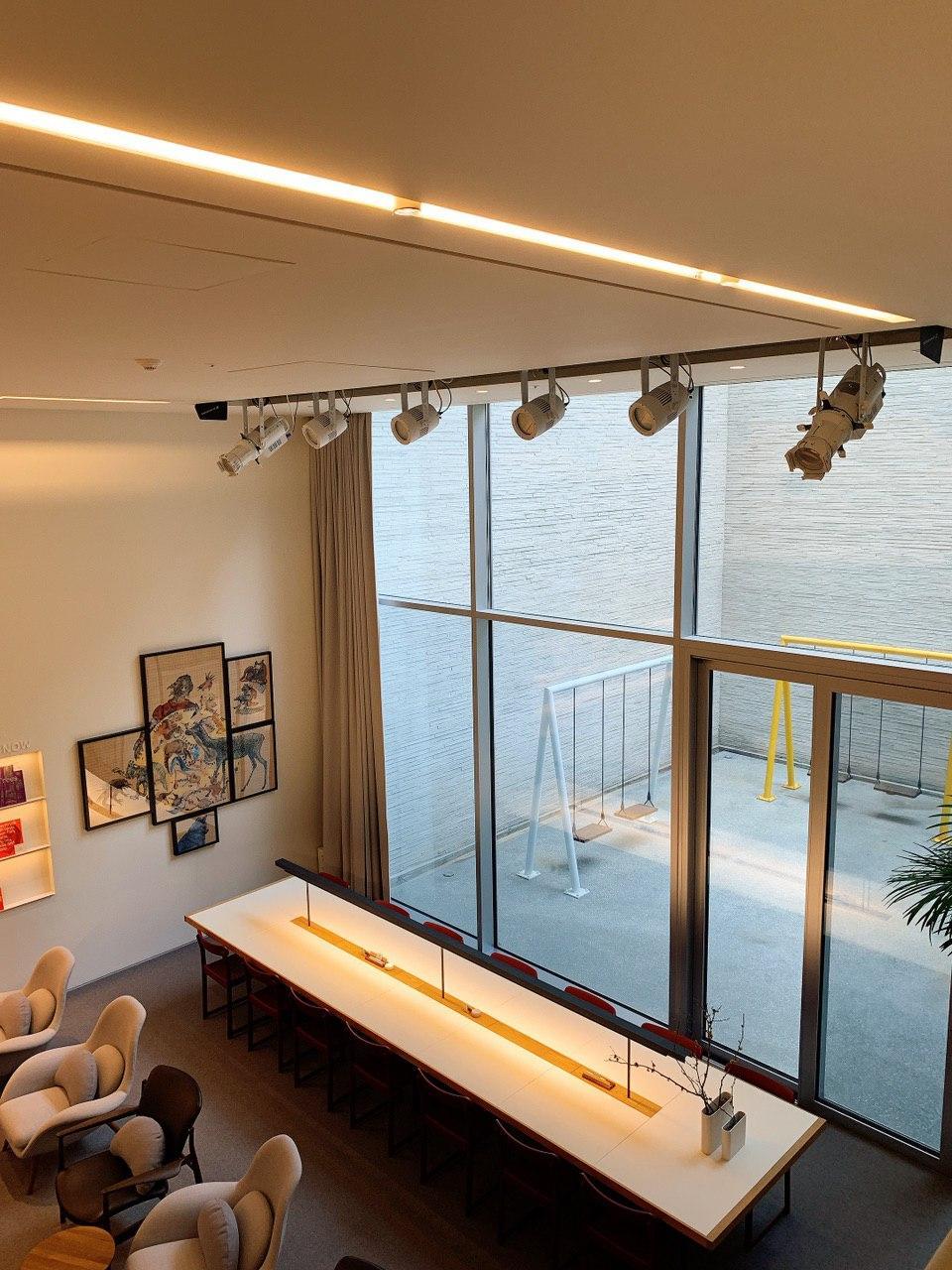 입구에서 책장을 따라 천천히 우측으로 걷다 보면 개인들을 위한 서재를 찾을 수 있다. 칸막이로 이루어진 예닐곱 개의 작은 서재 안에는 고급스러운 독서 의자가 각각 놓여있다. 덴마크 명품 가구 브랜드 프리츠 한센이나 핀란드의 아르텍 의자, 카시나의 LC4 체어 등 평소 사용해보고 싶었던 고급 서재용 의자들을 체험해볼 수 있는 기쁨을 준다. 이곳을 제외한 장소는 오픈형 공간이기 때문에 타인의 시선이 차단된 공간에서 편안한 자세로 혼자만의 시간을 갖고 싶다면 이곳을 적극 추천한다. 개인 서재의 방을 나와 맞은편으로 왼쪽 문으로 들어가면 탁 트인 예술의 방과 커다란 메인테이블이 나오는데 도서관의 전체 구역에서 가장 흥미로운 공간이었다.