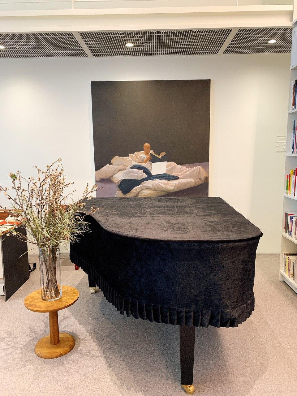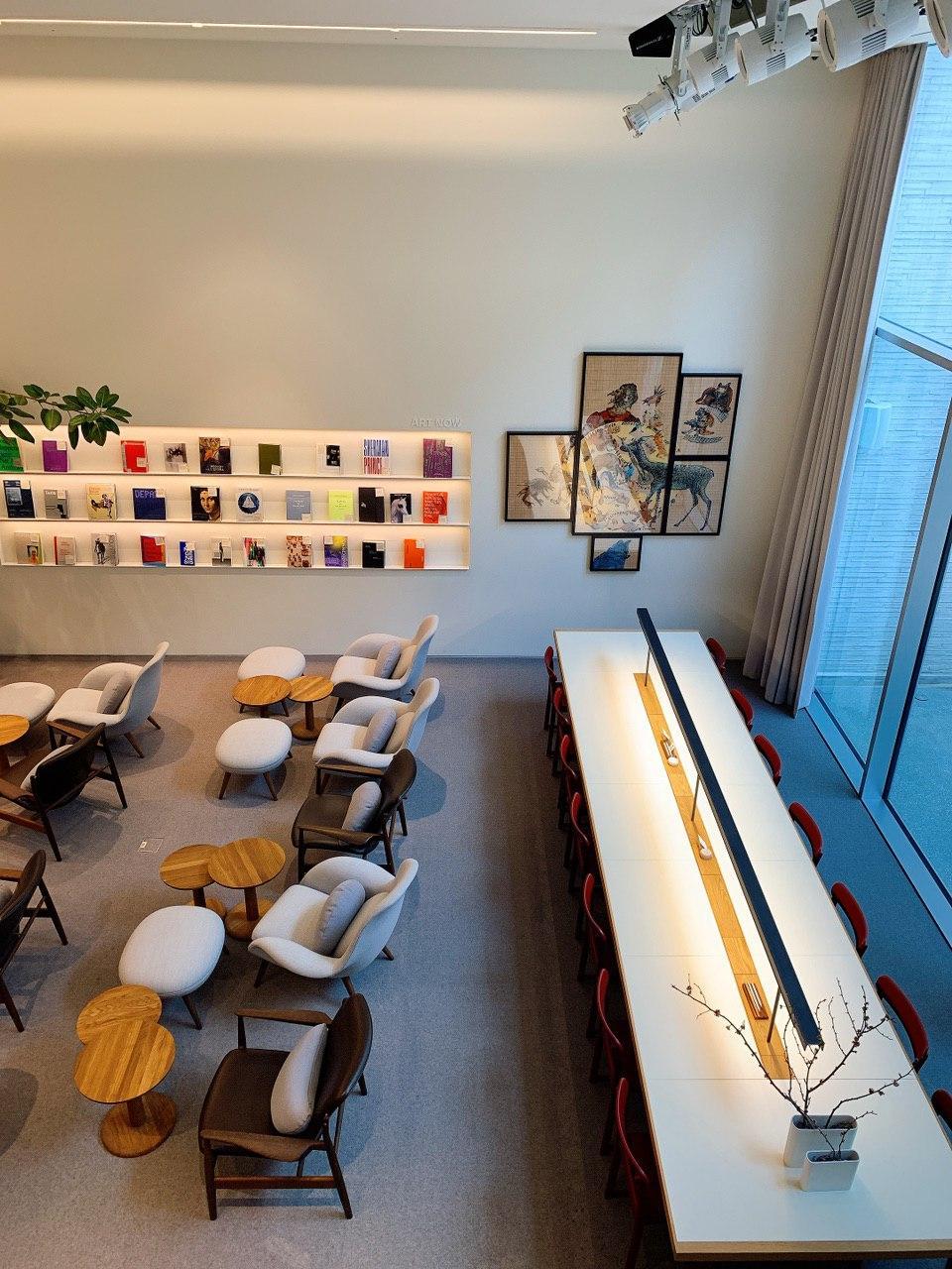 중정에서 쏟아지는 자연의 빛과 예술의 방의 조명이 어우러져 기분 좋은 조도를 형성하고 있는데 모든 사물이 예쁘게 보이는 필터 효과를 느낄 수 있다. (의미 없는 책장 사진은 그만 찍고 누군가와 함께 갔다면 꼭 여기서 자신의 프로필 사진을 찍어보길 권한다.) 나는 커다란 대리석 책상에 앉아 책과 아이패드를 꺼내고 읽고 쓰며 집중하는 시간을 보냈다. 고요하고 넓은 층고의 공간에서 고개를 살짝 돌리면 곳곳에 좋은 그림과 예술의 흔적들이 마음을 충만하게 해 주었다. 예술의 방 중앙에는 개인 독서 의자들이 즐비한데 강연이나 음악회 등의 행사가 기획된다면 편안한 의자에 앉아서 강연을 즐기기 좋은 구성이었다. 이층으로 올라가는 작은 계단이 나오는데 이곳을 오르면 4단의 책장에 역사책이 빼곡히 꽂아져 있다. 계단 초입에는 마시다와 여행하다라는 섹션이 흥미를 돋는다. 이곳에 올라서 반 바퀴를 돌면 예술의 방을 한눈에 내려다볼 수 있는 발코니가 나온다. 이곳에 서서 예술의 방을 둘러보면 멋진 광경을 볼 수 있다. 예술의 방의 책장에는 값비싼 원화집부터 유명 미술관의 도록 그리고 미술 철학에 대한 책 등 다양한 예술서들이 망라되어있다. 책장에서 표지를 한껏 들어낸 예술서들은 스스로가 이 방의 주인이라는 듯 매력을 뽐내고 있다.