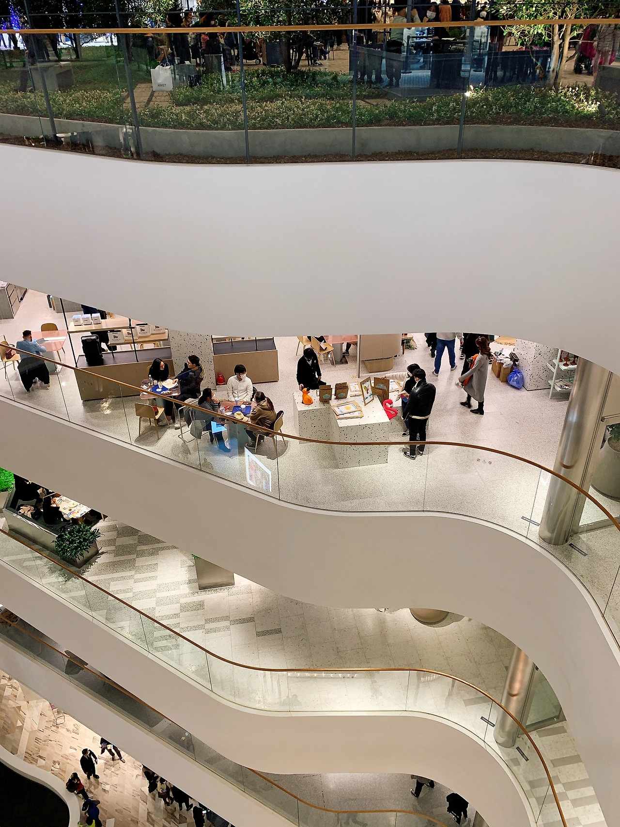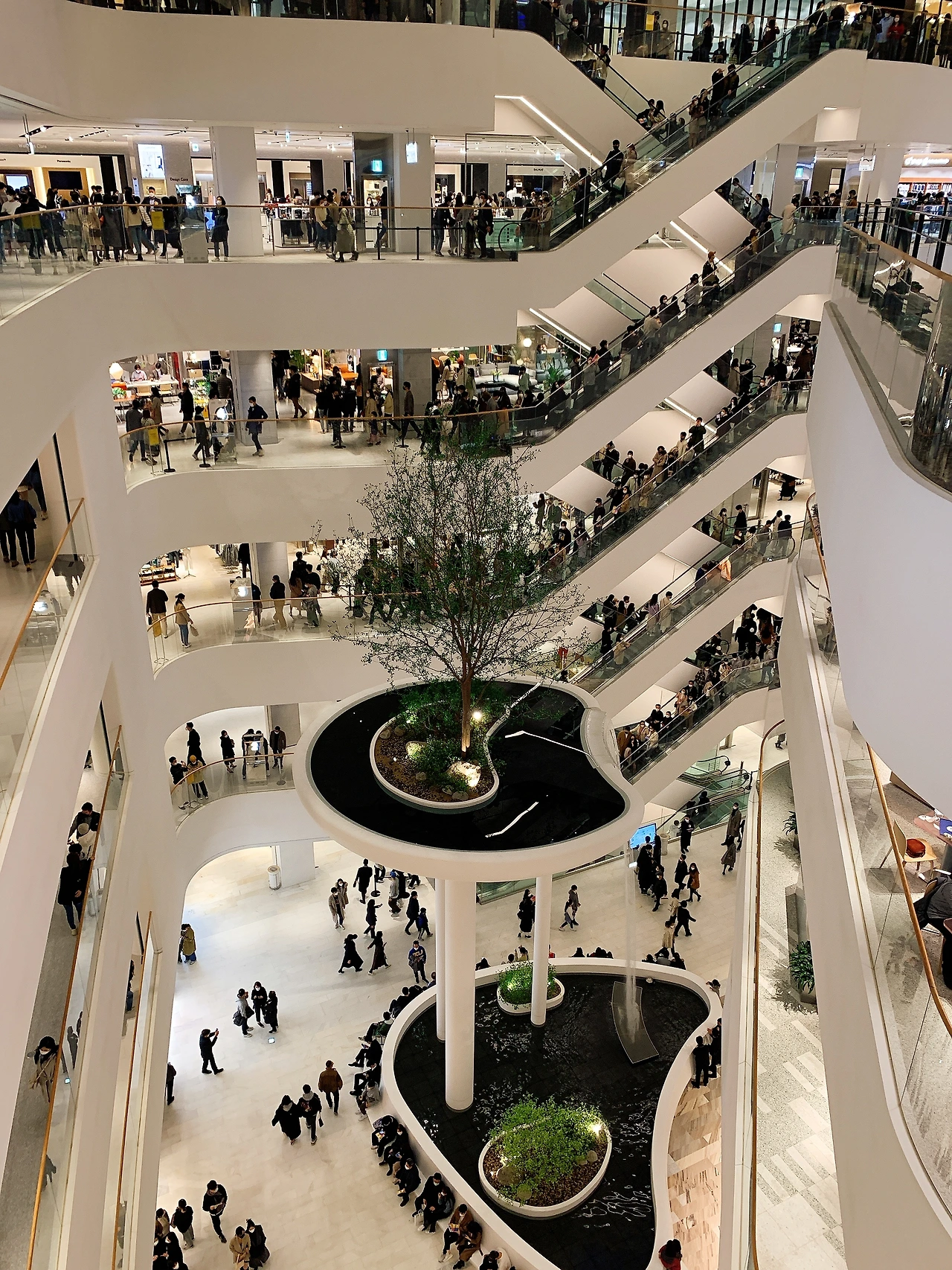 첫째 : 개인이 필요로 하는 최소한의 공간을 방문객 모두가 얻음으로 보다 쾌적한 쇼핑을 즐길 수 있다. 건축 용어에 퍼스널 스페이스라는 말이 있다. 타인이 접근이 불편하게 느끼지 않을 수 있는 최소한의 개인의 공간을 말하는데 보통 개인을 중심으로 1m 내외의 거리를 두는 것이다. 분명 수많은 인파가 몰렸음에도 불구하고 대부분의 매장에서 여유 있는 쇼핑이 가능했다. (물론 휴식을 취하는 사운즈 포레스트(5층 정원), 푸드 매장(지하 1층) 그리고 층별 이동 통로인 에스컬레이터(무려 세 개나 있지만)는 사람들이 꽤 붐볐다.)