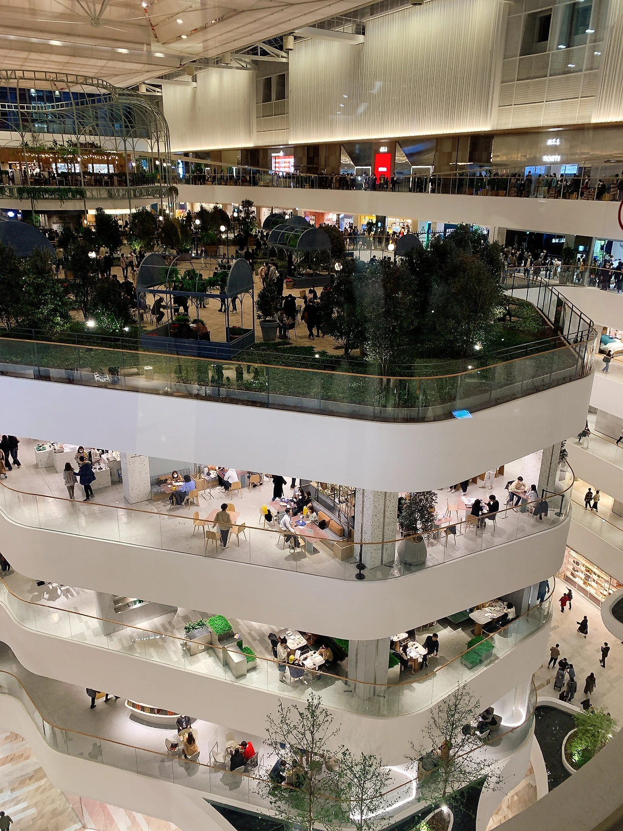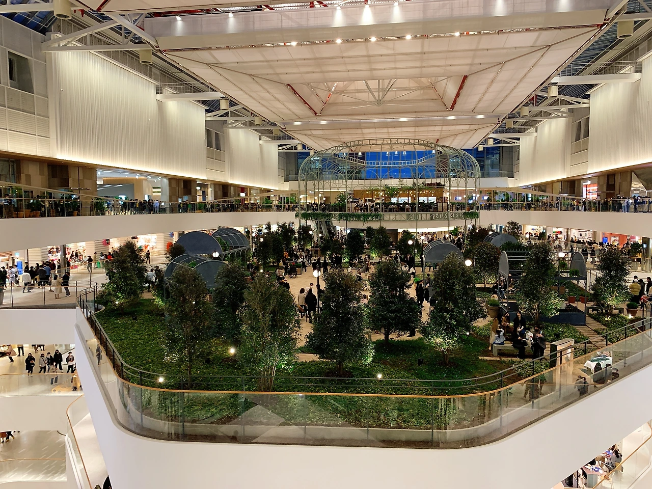 더 현대 서울의 백미를 뽑자면 역시 5층의 사운즈 포레스트다. 천공의 성 라퓨타와 같은 느낌을 주는 이 공중 정원은 더 현대 서울의 한가운데 자리 잡고 있다. 이곳은 약 1,000평 규모로 꾸며진 실내 정원이다. 많은 시설이 가든 혹은 보타닉이라는 이름을 붙이며 엉성한 풀때기를 한 뭉텅이씩 배치하는 경우가 많다. 그런데 이곳은 실제 흙에 뿌리를 박은 나무들과 잔디가 깔려있는 인도어 정원이다. 열대우림의 과도한 울창함이 아니라 자연과 어우러진 현대적 공간으로 보면 좋을 것 같다. 사운즈 포레스트 한가운데에는 블루보틀 7호점이 자리 잡고 있는데 이곳에서 내린 스페셜 티를 마시며 정원의 밴치에서 휴식할 수 있다. 사운즈 포레스트는 5층과 6층을 자연스럽게 연결하는 중정 역할을 한다. 이곳을 중심으로 라이프 스타일 브랜드와 푸드코트 그리고 문화 공간이 펼쳐진다. 이곳 덕분에 더 현대 서울은 쇼핑하기 위해 가는 곳이 아닌 쇼핑을 즐기는 곳이라는 표현이 아깝지 않게 되었다. (스타벅스 리저브 매장은 MZ세대를 위한 지하 1층에 자리 잡고 있다. 대중적인 스타벅스보다는 고급스러움을 추구하는 블루보틀이 그 자리에 들어선 모습이 꽤 상징적이었다.) 사운즈 포레스트 말고도 곳곳에 자연과 정원을 모티브로 한 오브제가 잘 기획되어 있다. 특히 공중 정원의 폭포는 사진을 찍기 좋은 조형물이다.