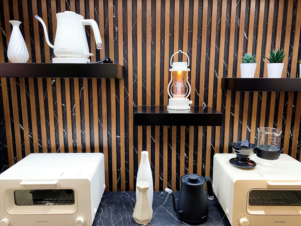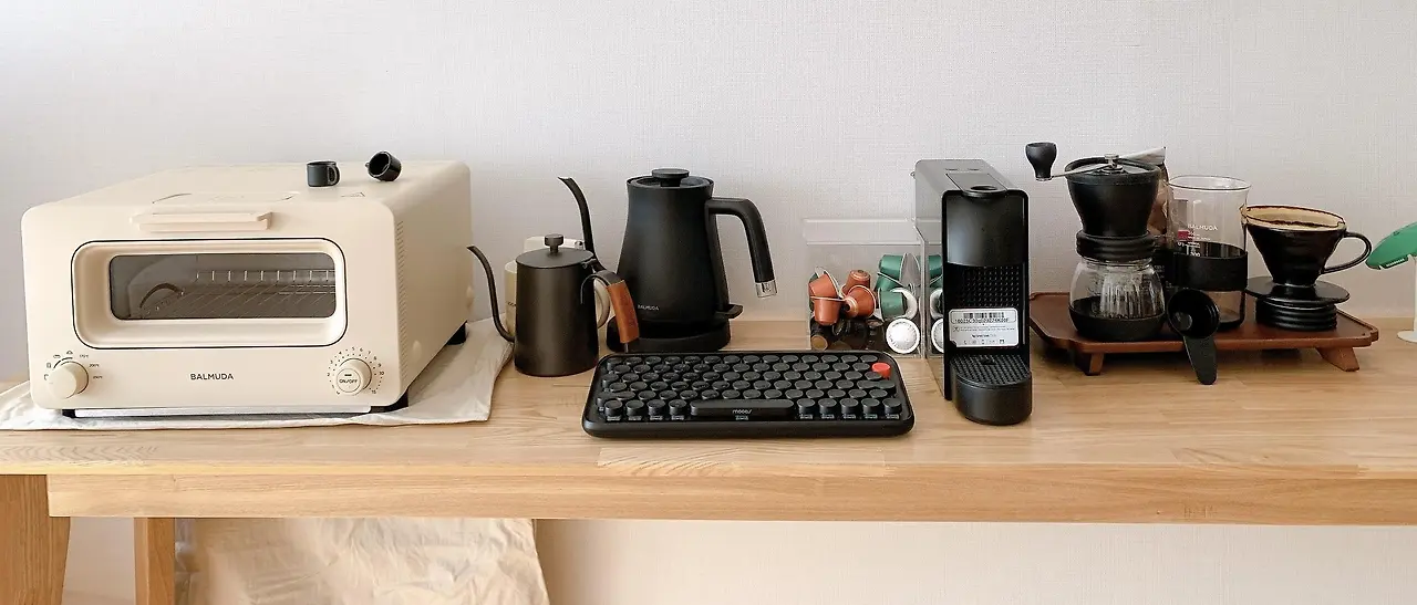 그렇다면 테이블 위에 무엇을 올리면 좋을까 라는 나의 내적 질문에 가장 먼저 떠오른 대답은 발뮤다 더 토스터와 발뮤다 더 팟 그리고 하리오 드리퍼 세트였다. 발뮤다 더 팟은 주둥이가 가늘고 좁아 핸드 드립 커피를 내리기 좋다. 그런데 커피와는 상관없는 더 토스터는 왜 떠올렸냐고 물을 수 있다. 내 취향에는 커피와 빵은 한 몸이다. 커피가 가지고 있는 기본 행복 지수가 100이라면 여기에 빵을 곁들이는 순간 0이 하나 더 붙는 마법이 일어난다. 나름 합리적인 이유를 만들어 낸 나는 고민 없이 발뮤다 더 토스터와 더 팟을 구매하였다.