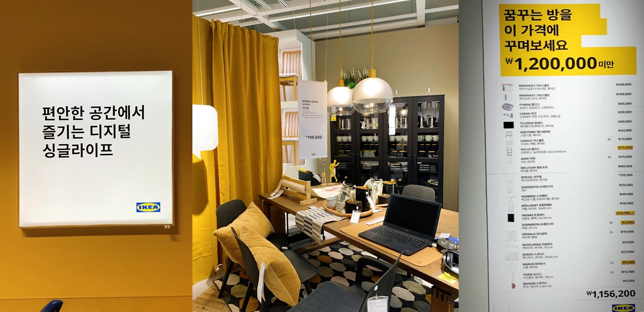 (쇼룸을 설명하는 한 줄 카피, 이케아 가구들로 꾸며진 쇼룸, 쇼룸을 구성하는 가구의 구성표)