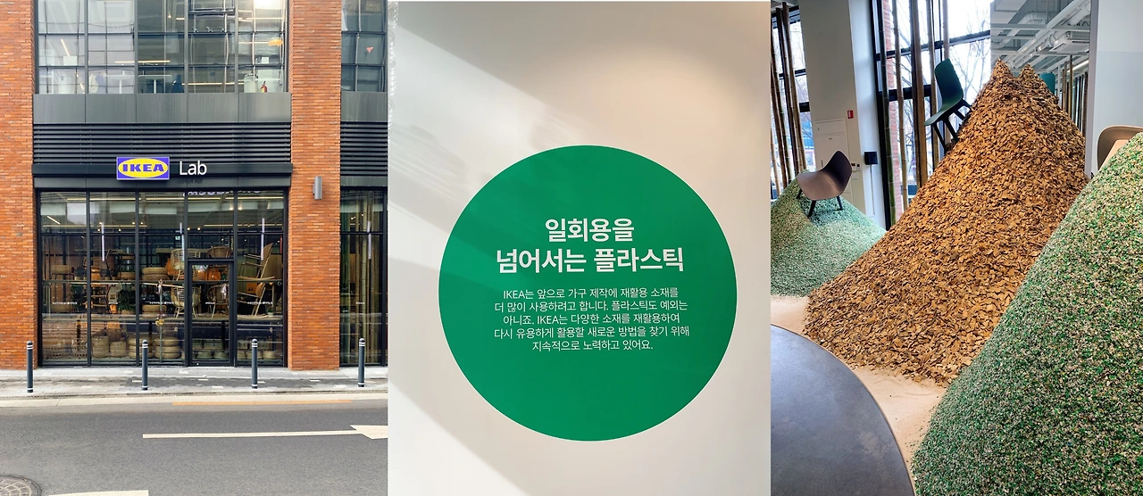 그런 위험을 미리 감지한 이케아는 2014년부터 자신들의 신념에 지속 가능성을 핵심 가치로 추가하였다. 여전히 저렴하지만 가구를 보다 오래 사용할 수 있도록 디자인한다. 또한 기존의 자원을 재활용해 리사이클링 가구를 만들거나 더이상 쓰지 않는 이케아의 가구를 회수하여 중고로 재판매하기도 한다. 이러한 일련의 활동을 통해 이케아는 가구 생산 기업에서 자원을 순환시키는 환경 기업으로 전환하고 있다. 최근 성수동에 생긴 <이케아 Lab>을 방문하면 이케아가 지속 가능한 세상을 만들기 위해 어떤 노력을 하고 있는지 확인할 수 있다. 이곳에서는 이케아가 리사이클링을 통해 만든 가구와 소품들을 판매하고 있으며 플라스틱과 나무를 어떻게 활용하고 있는지를 알려 주는 전시관을 운영하고 있다.