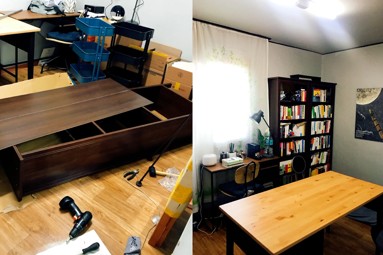 (브루살리 책장을 조립하는 모습, 9시간 동안 가구를 조립하여 꾸민 작업실)