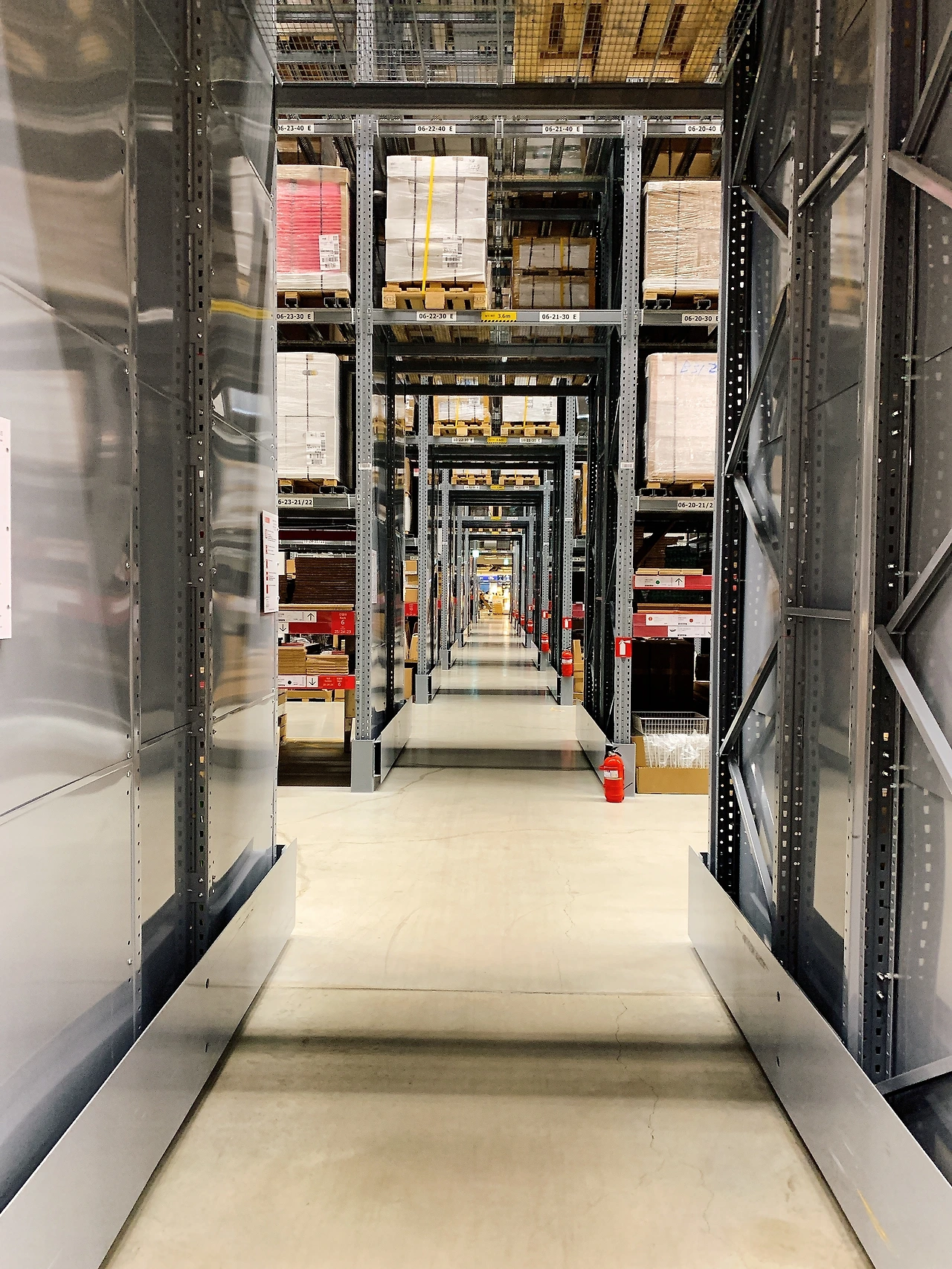 (셀프서브 구역: 다양한 가구가 플랫팩 패키지 형태로 고객들의 픽업을 기다리고 있다.)