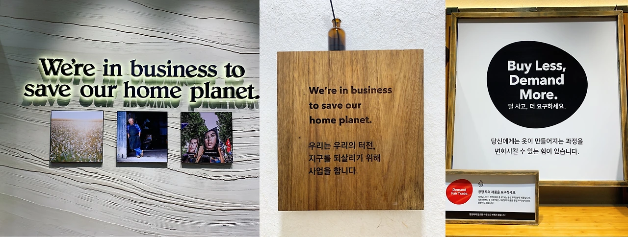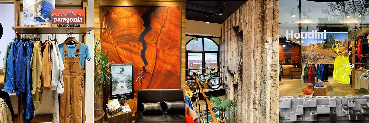 나는 최근에 스타필드에 있는 파타고니아 매장을 찾았다. 파타고니아 매장에는 파타고니아의 옷과 더불어 자연을 연상시키는 다양한 전시물과 메시지 싸인이 전시되어 있었다. 거대한 암벽을 타고 오르는 등반가와 파타고니아의 옷을 직접 수선하는 사람들 그리고 트레킹을 하고 있는 각양각색 사람들의 모습이 담겨 있는데 이들의 역동적인 모습에서 생명력이 느껴졌다. 또한 제품을 진열하는 선반이나 테이블이 나무로 되어 있고 매장 곳곳에 나무와 바위 질감을 활용하여 꾸며져 있었다. 자연과 유사한 느낌을 주어 자연 속에 있는 것과 같은 편안함과 자연스러움을 전달하려는 의도로 생각되었다.