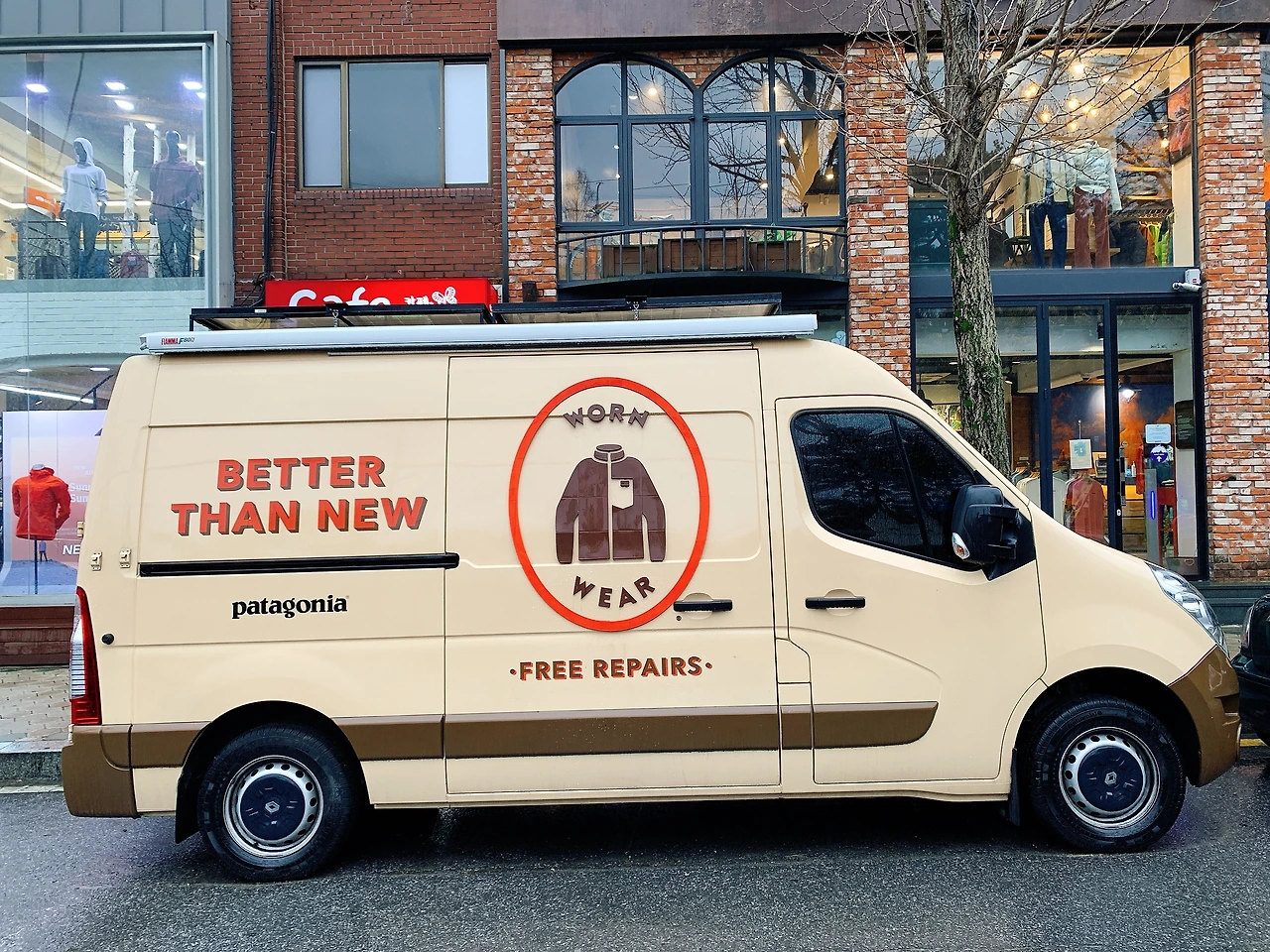 (헌 옷을 고쳐 입으라는 메시지를 전달하는 파타고니아의 캠페인 차량)