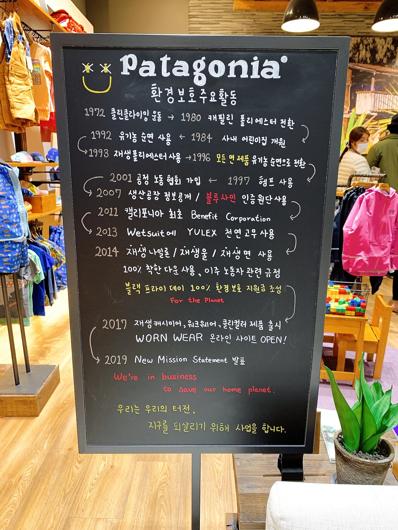(매장 곳곳에 메시지 보드를 두어 파타고니아의 철학 전달하는 모습)