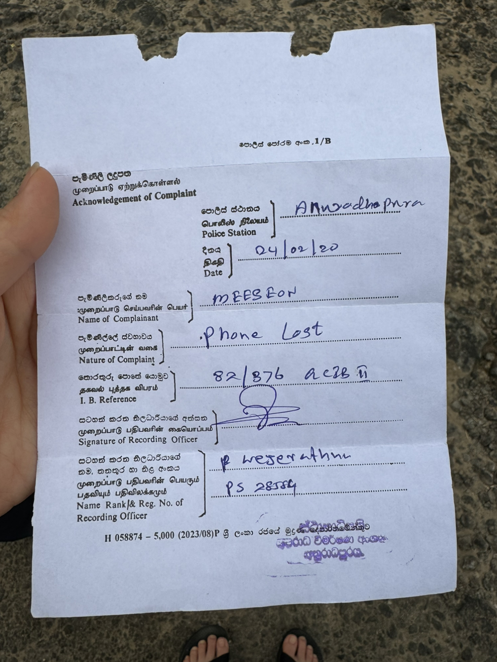 7. 호텔로 돌아가 사건의 전말을 알리는데, 경찰에 신고해준 소녀에게 연락이 옴. 아누라다푸라 최고의 천재 소녀는 휴대폰을 강탈당한 장소를 알면 그 일대 호텔 CCTV를 돌려 범인을 잡을 수 있을 거라는 희망을 심어줌. 그러나 초행인 내가, 심지어 길치에 방향치인 내가 그 위치를 기억할리 만무함. 일단 경찰이 출동하여 경찰차 타고 그 일대를 열심히 돌아다녔으나 도난 위치를 확정하지 못함. 결국 경찰서 가서 조서 씀.