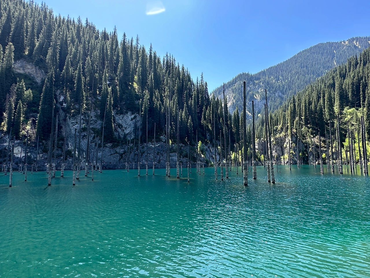 콜사이호수 국립공원 내에는 카인디호수도 있다. 1911년 대지진 때 계곡이 매몰돼 자연 댐이 만들어지면서 만들어진 호수다. 호수가 만들어지면서 원래 계곡에 있던 자작나무 숲이 수몰됐는데, 코발트색 물빛과 생선 비늘처럼 반짝이는 자작나무가 만들어낸 풍경을 보기 위해 많은 여행자들이 이곳을 찾는다. 물에 잠긴 지 100년이 넘었지만, 물의 석회 성분과 광물질의 영향으로 자작나무가 썩지 않았다고 한다. 카인디호수는 매일 조금씩 수심이 낮아지는 곳으로 10~20년이 지나면 사라질 풍경이라고 한다.