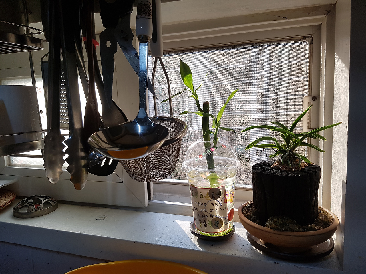 부엌 창가에 화분을 키우면 좋다는 글을 본 적이 있다. 굳이 풍수지리까지 들먹이지 않더라도, 많은 시간을 머무는 공간에 마음 쓸만한 무언가를 두는 게 좋을 성싶었다.