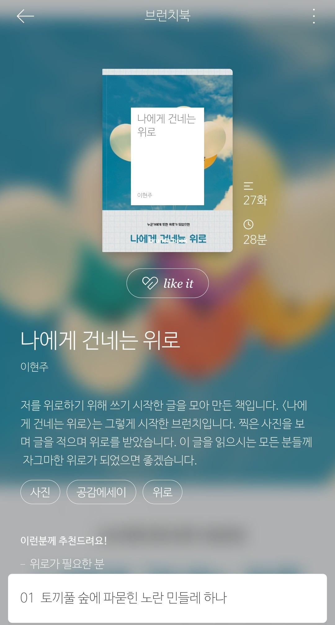 저를 위로하기 위해 쓰기 시작한 글을 모아 만든 책입니다. <나에게 건네는 위로>는 그렇게 시작한 브런치입니다. 찍은 사진을 보며 글을 적으며 위로를 받았습니다. 이 글을 읽으시는 모든 분들께 자그마한 위로가 되었으면 좋겠습니다.
