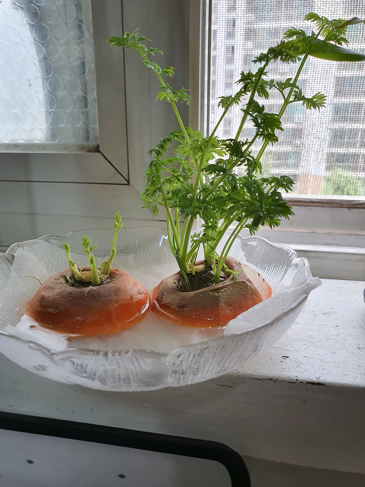 부엌 창가에 첫번째 당근 옆에 두번째 당근 : 당근에 잎이 나다 (시리즈39) 부엌 창가가 확실히 명당 자리인 모양이다. 볕도 잘 들고 바람도 좋고.. 첫번째 당근이 잘 자라서, 당근 하나를 더 키우�