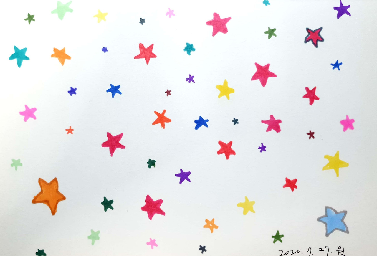 2년 만에 그림을 그리려고 노트를 꺼냈는데 뭘 그릴까? 아니 뭘로 시작하지? 하다가 문득 별을 그리게 됐다. 거금 주고 산 마카도 손에 익힐 겸 여러 가지 색깔의 마카를 꺼내서 열심히 별을 그렸다. 얼마나 열중했는지 시간 가는 것도 모르고 열심히 그렸다. 열어놓은 창문 밖에 사람들이 지나가는 소리, 아이들이 떠드는 소리, 자동차 지나가는 소리 온갖 소리가 나고, 어디선가 스멀스멀 올라오는 음식 냄새가 들어왔다가 나가는데 아랑곳하지 않고 별을 열심히 그렸다. 별거 아닌 별을 그리면서 이렇게 열심히 하다니..