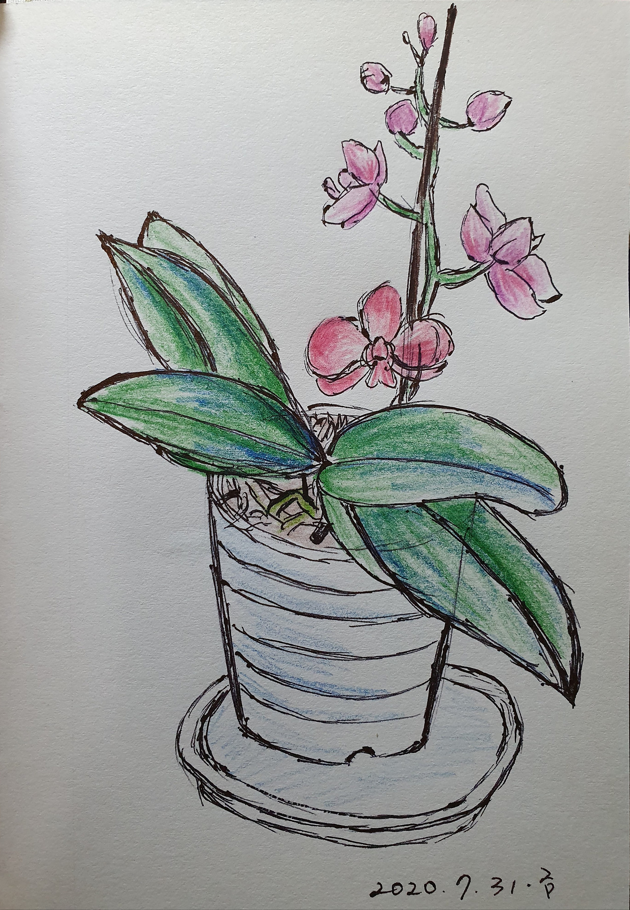 호접란 꽃대가 올라오다2 6월 중순에 우연히 호접란 꽃대가 올라온걸 발견했다. 신기하고 기특해서 매일매일 들여다봤다. 옆으로 기울어져 자라는 꽃대에 지지대를 대주었다. 잎도 튼튼해 보이�