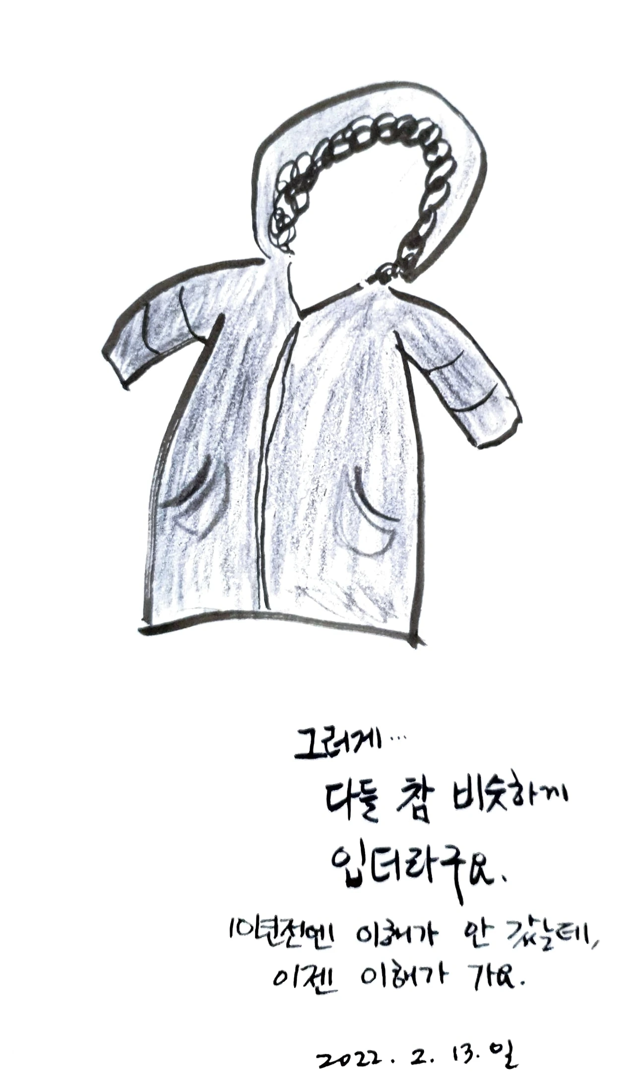 남의 나라에서 사서 입고 온 알록달록한 패딩이 낡아져 새로 패딩을 장만해야 했을 때, 나 역시 까만 패딩을 고민 없이 집어 들었다. 이제 남들처럼 무채색 계열의 옷에 손이 간다. 이제 더 이상 까만 옷이 이상해 보이지 않는다. 원래 살고 있던 사람처럼 잘 적응해서 살고 있다.