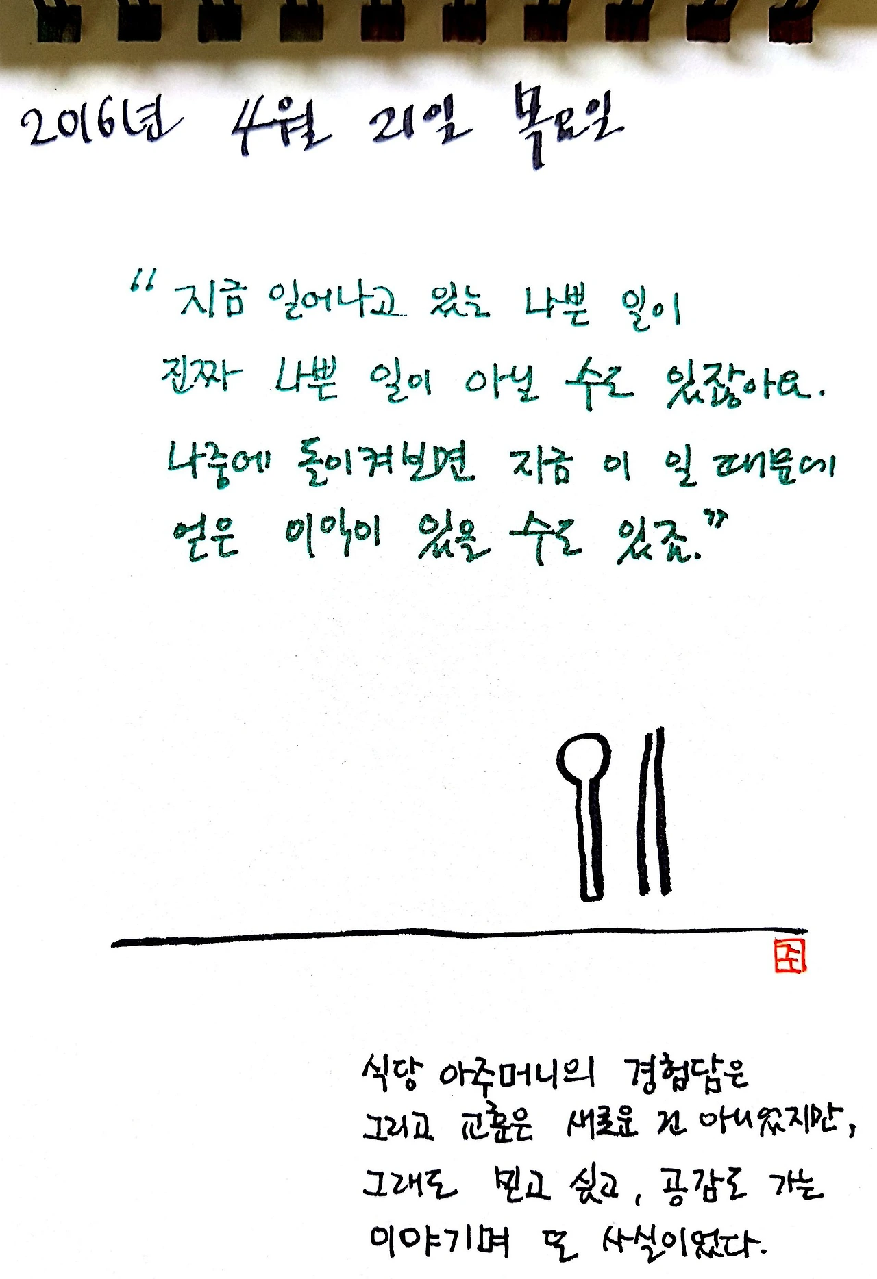 당장은 기분이 상당히 나빠서 다시 돌아보고 싶지 않던 일도, 며칠 있다가 다시 생각해 보면 나쁘기만 한건 또 아닌 거 같고. 몇 년 지나서 돌아보면, 오히려 잘 된 일이었다고 고백하기도 한다.
