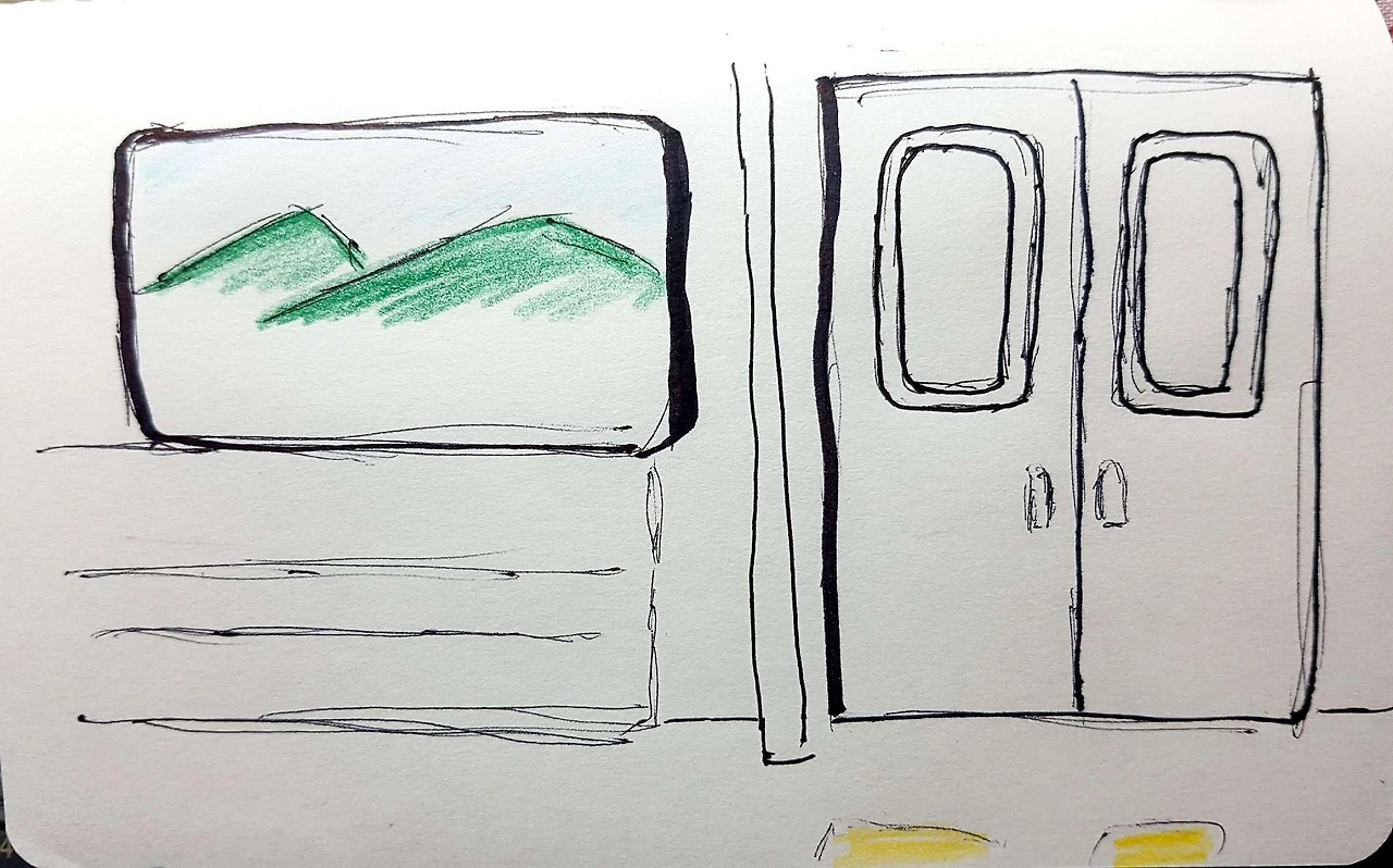 한강도 보이고, 유심히 안 봐서 몰랐는데 의외에 장소에서 산도 보였다. 메모지 꺼내서 쓱쓱 볼펜으로 그렸던 그림이다.