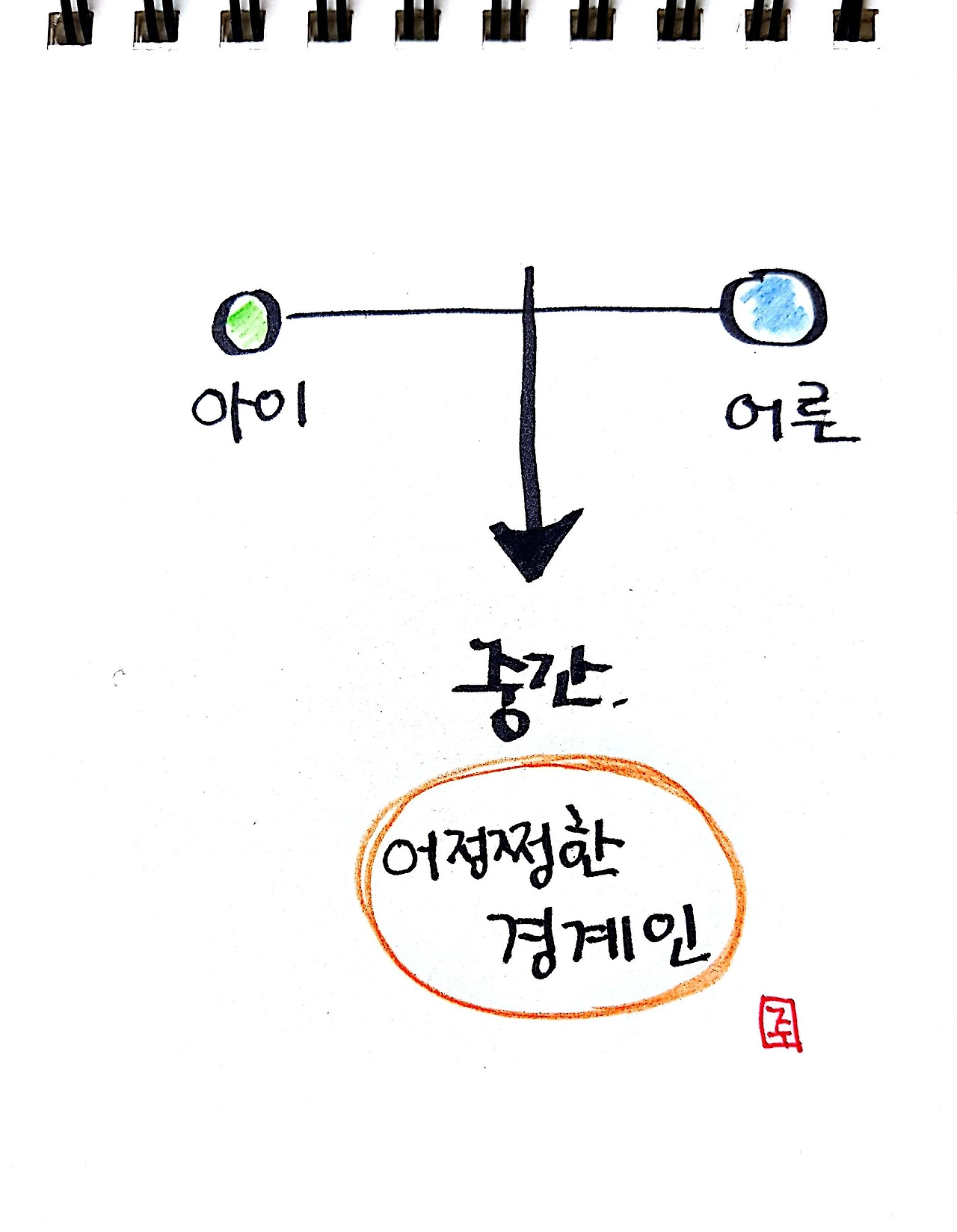그런데 13년 차 아줌마이지만, 애가 없다 보니 아직도 "애"로 분류가 된다. 안타깝게도 물리적인 나이는 먹어버린 상태라 아이는 아니지만, 그렇다고 어른으로 대접받지도 못한다. 또래와는 대화가 되지 않고, 그렇다고 나보다 한참 어린 분들과도 잘 통하지는 않는 참 어정쩡한 중간 경계인이 돼버렸다.
