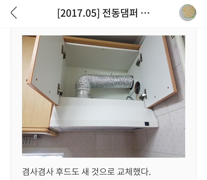 아래층에서 음식냄새가 심하게 올라와서 검색해 보다가 후드에 '전동댐퍼'를 설치했다. 전동댐퍼 설치하면서 후드도 바꿨다. 이것 덕분에 그나마 음식냄새를 많이 막을 수 있었다.