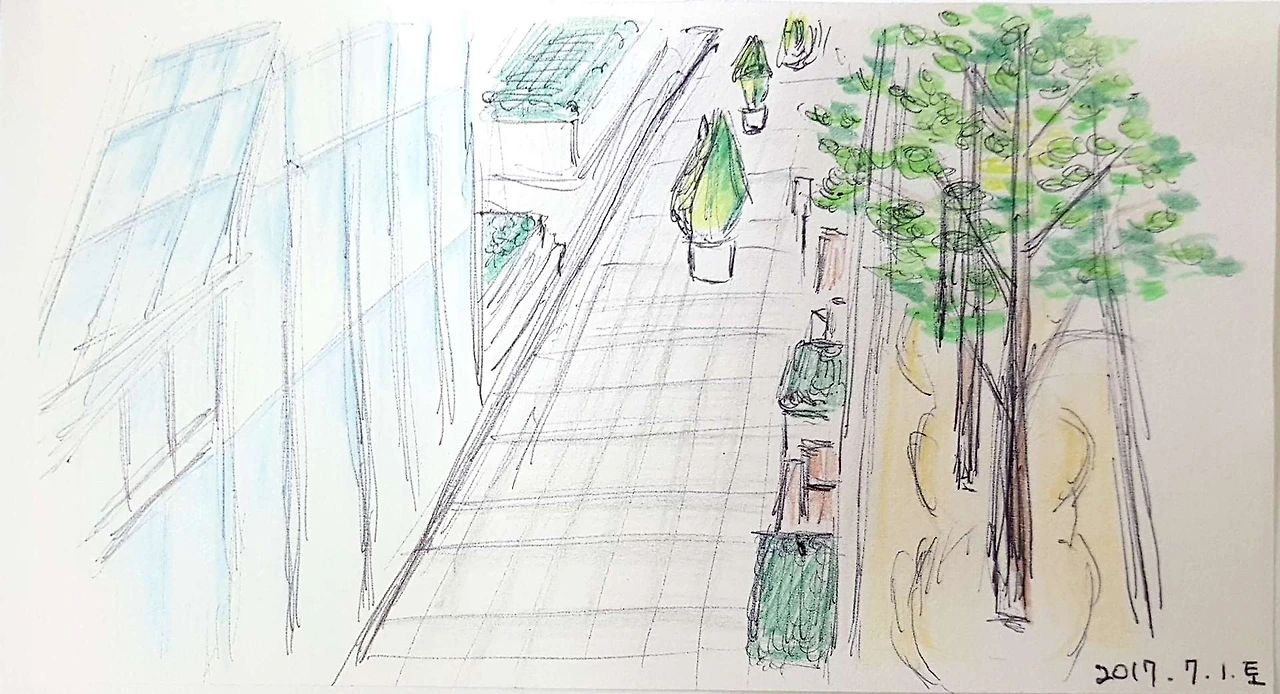 카페에서 음료수 마시며 그린 바깥 풍경. 시원한 건물 안에서 내다보는 바깥 풍경은 평온했다. 실제 밖은 덥고 습하고 짜증 날지라도... 멀리서 본 풍경은 그랬다.