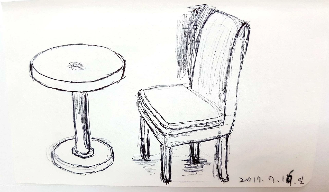 3월 말에 임신해서 내내 누워서 4개월을 보내다가 움직이기 시작했다. 그러면서 조심스럽게 바깥세상 구경을 했다. 이 그림도 그 당시 카페에 갔다가 노트를 꺼내서 이것저것 따라 그렸던 그림 중에 하나다.