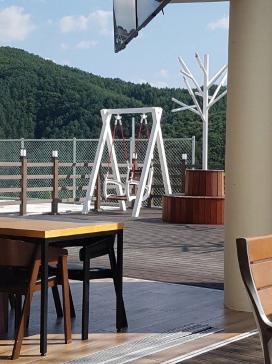 8.31~9.3 여행(8) : 춘천 산토리니 카페, 해질녁 근사했던 가볼만한 곳 : 춘천 가볼만한 곳이라는 "산토리니 카페"에 가다. 근사한 풍경이 눈앞에 펼쳐진 곳, 음식도 맛있었다. - 레스토랑 2층 테라스