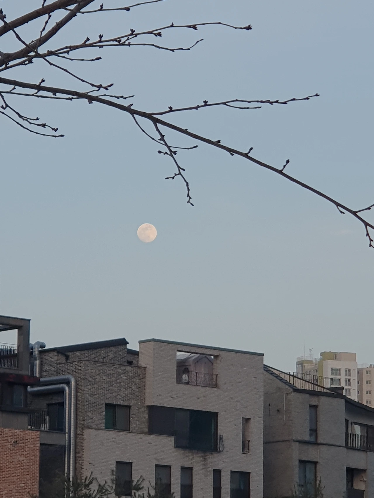 정월대보름날에 눈과 비 예보가 있어, 달 보기 어려울려나 했는데.. 전날 그래도 달을 볼 수 있었다. 하얀 달은 꽤 밝고 선명했다. 이사 와서 처음 이쪽 공원 왔을 때도 저렇게 달이 크고 동그랬는데.. 달 보니까 그때 생각이 났다.