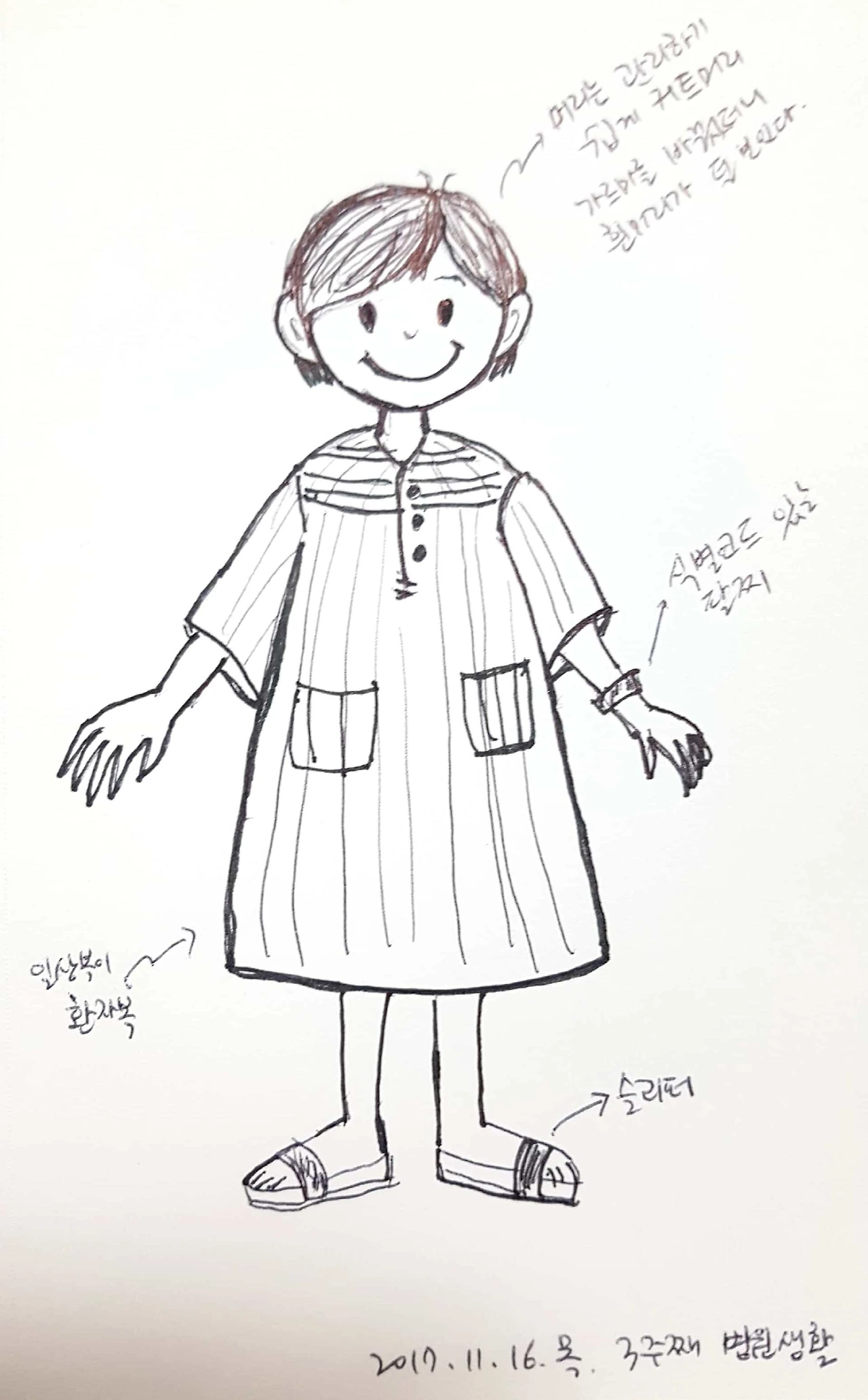 아는 동생이랑 카톡을 주고받는데, 그렇게 병원생활하는 것도 나중에 돌아보면 추억이 될 테니 환자복 입은 모습을 셀카로 남겨보라고 했다. 평소에도 셀카 찍기 싫어하는데 병원에서?! 그래서 대신 그렸다.