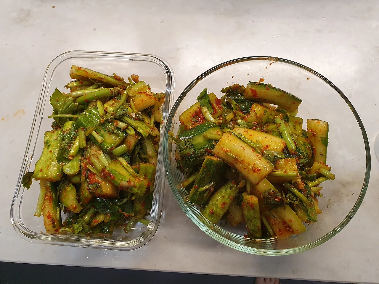 저 위에 망친 오이 반찬도 4일 지나 짠 물이 더 빠지고 나니 처음보다 났다. 다음번에는 부추랑 당근 채친 것도 넣고, 절일 때 소금과 설탕도 덜 넣어봐야겠다. 두어 번 더 망치고 나면 감이 오지 않을까?
